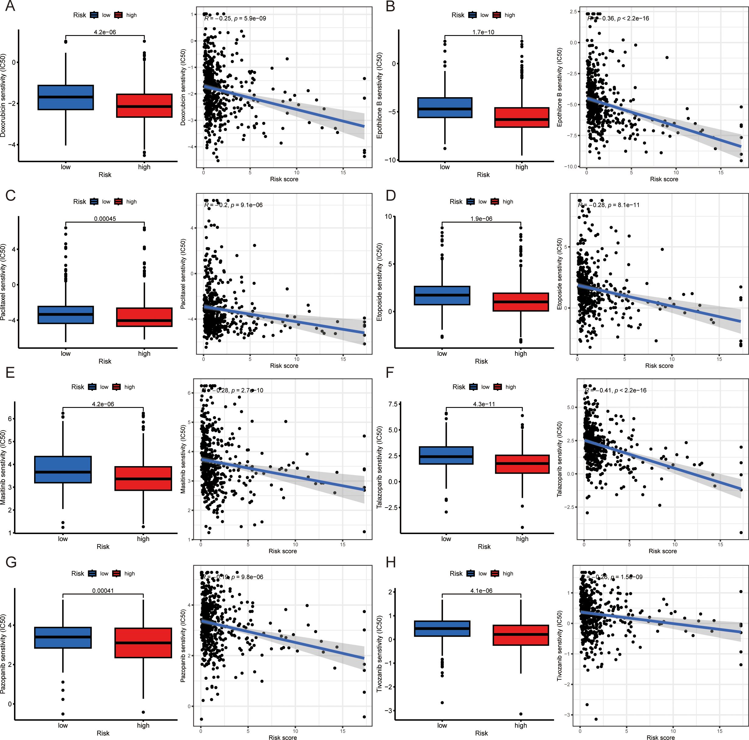 Figure 6. Drug sensitivity differences in patients with various risk scores. (A-H) Drug sensitivity disparities and correlations between high- and low-risk score groups: doxorubicin (A), epothilone B (B), paclitaxel (C), etoposide (D), masitinib (E), talazoparib (F), pazopanib (G) and tivozanib (H). *IC50: half maximal inhibitory concentration.