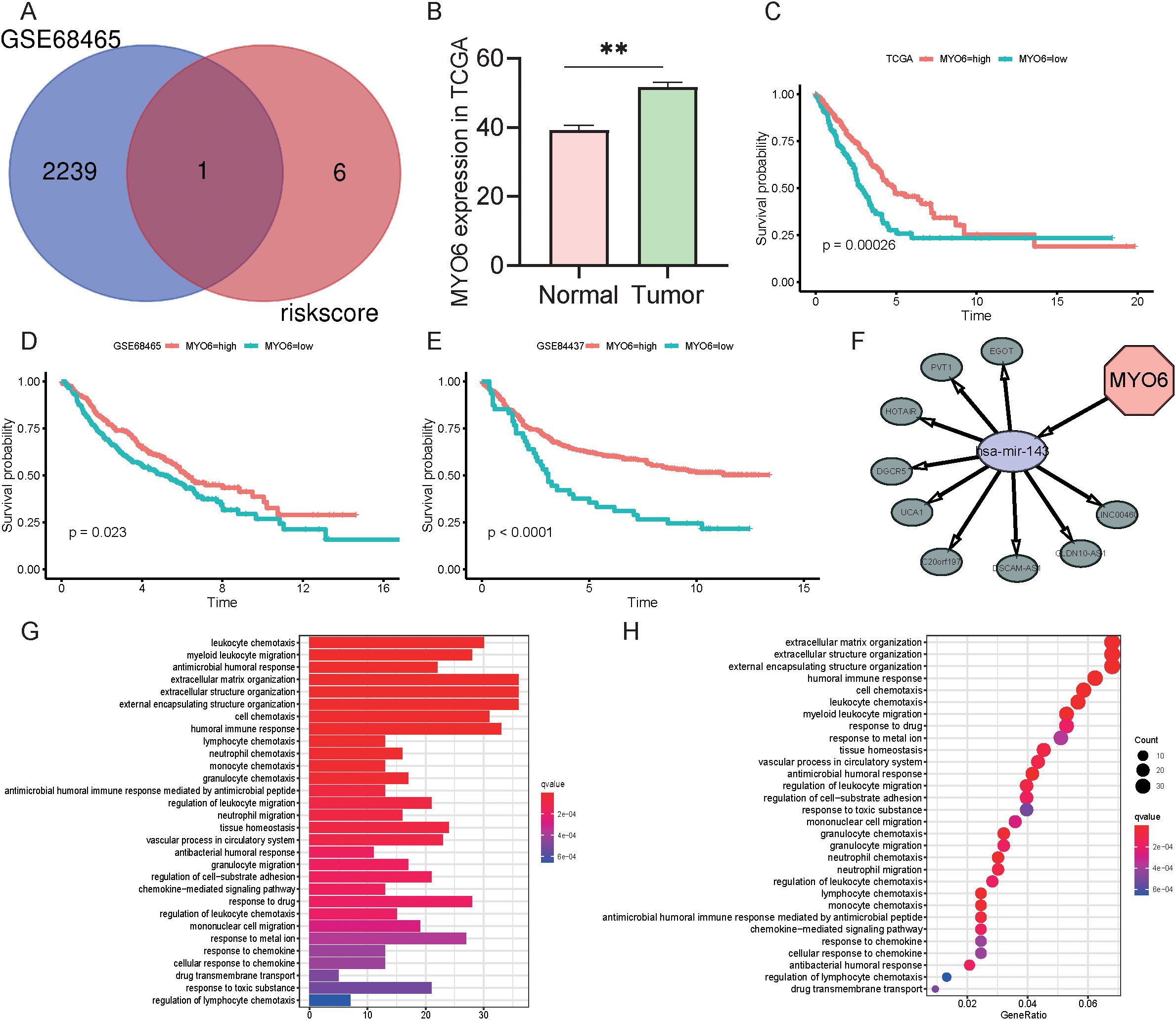 Figure 7. Role and function of MYO6 in NSCLC. (A) Venn diagram of the DEGs in GSE68465 and seven TRGs. (B) The expression of MYO6 in the TCGA cohort (normal group n=59, tumor group n=541). (C-E) Kaplan-Meier analysis compared the survival of high- and low-risk groups (defined by the optimal cut-off) in the TCGA (n=365 high vs. n=142 low) (C), GSE68465 (n=217 vs. n=225) (D), and GSE84437 (n=386 vs. n=47) (E) cohorts. (F) Construction of ceRNA networks using MYO6 as a target gene. (G) GO enrichment analysis using MYO6 as a target gene. (H) KEGG enrichment analysis using MYO6 as a target gene.
