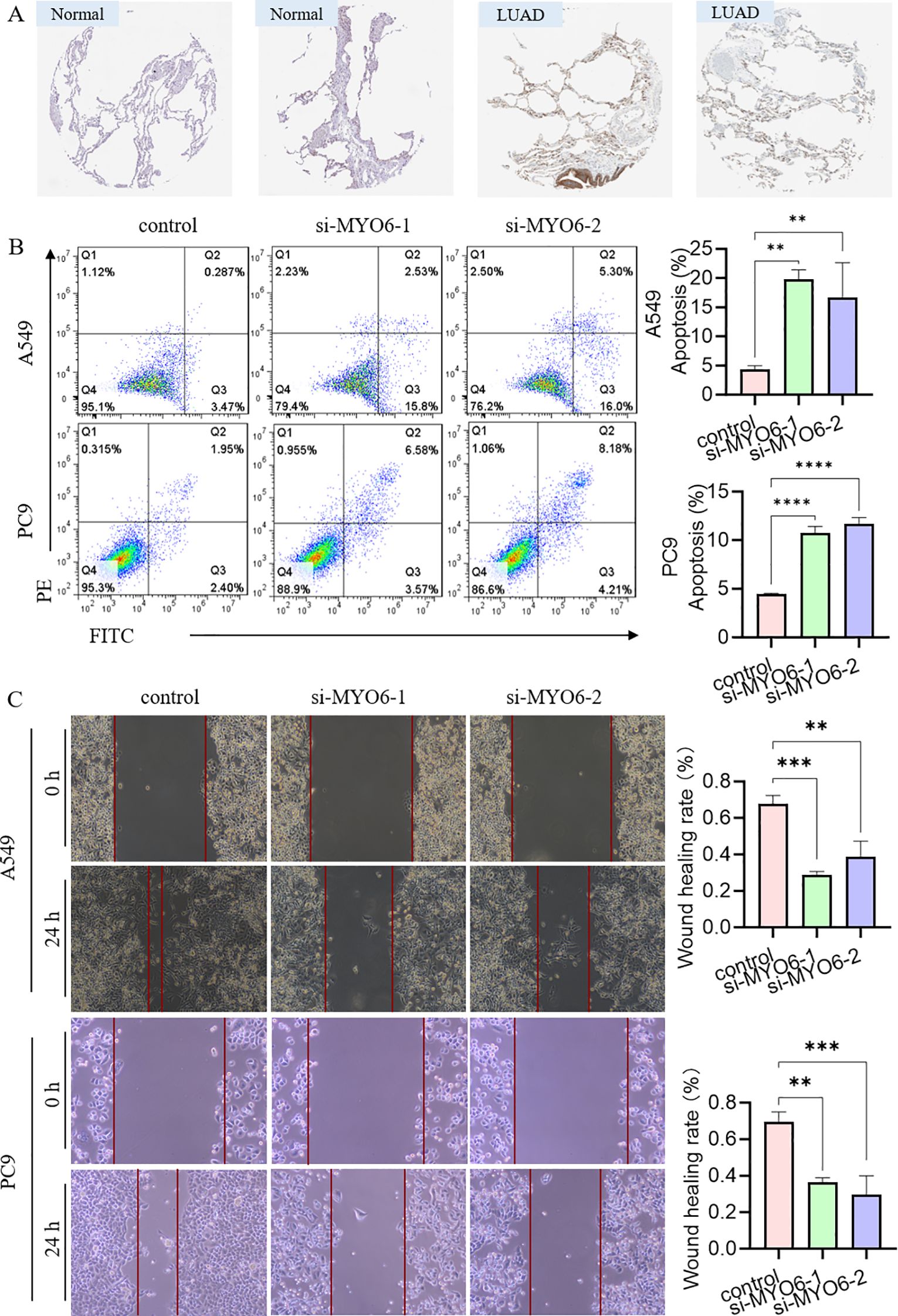 Figure 8. The effect of MYO6 on tumor proliferation in NSCLC. (A) Images showing the protein expression of MYO6 in normal tissue and LUAD. (B) The cell proliferation ability of A549 and PC9 cells was detected via an apoptosis assay after MYO6 knockdown (mean ± SD, n = 3). (C) The migration rates of A549 and PC9 cells were evaluated via a scratch assay after MYO6 knockdown (mean ± SD, n = 3).