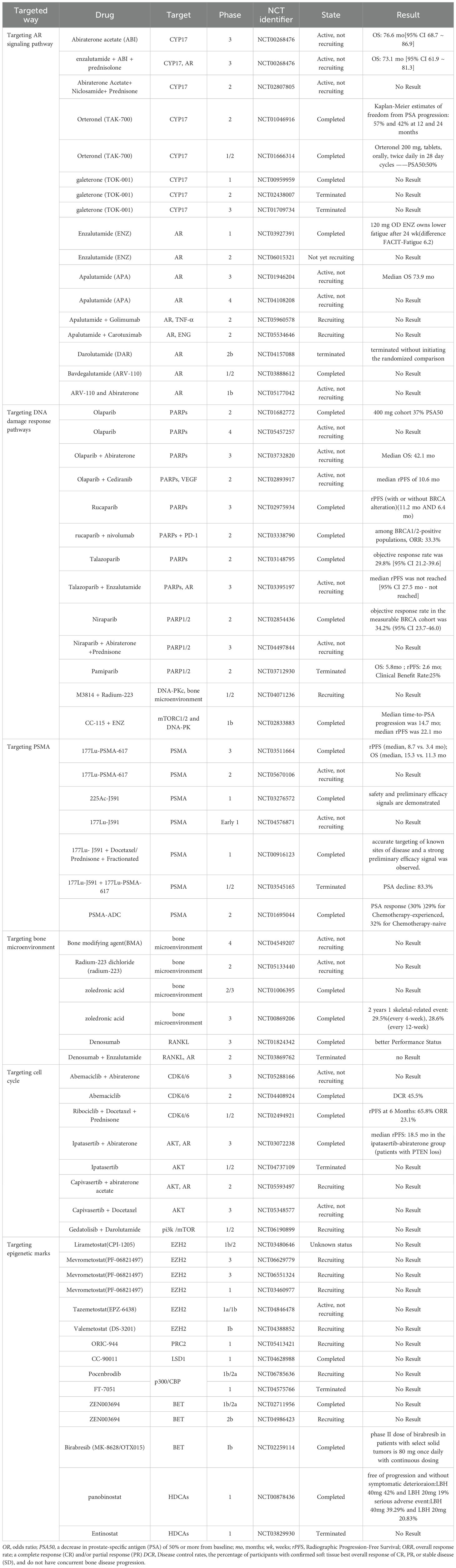 As of 2020, prostate cancer is the most frequently diagnosed cancer among men in 112 countries. It represents one in every 14 cancers diagnosed worldwide and accounts for 15% of all cancers in men. Androgen deprivation therapy (ADT) is an important treatment for prostate cancer by reducing the levels of androgens in the body to inhibit the tumor growth. The disease can be categorized based on its response to ADT: Castration-Sensitive Prostate Cancer (CSPC) and Castration-Resistant Prostate Cancer (CRPC). CSPC is an early stage of metastatic prostate cancer, in which ADT, as an important treatment method for cancer, can effectively inhibit tumor growth by reducing testosterone levels in the body. Concurrently, chemotherapy and next-generation hormone therapy have been extensively utilized at this stage, as the efficacy of these treatments continues to be validated (1). Castration-resistant prostate cancer (CRPC), as an advanced stage of prostate cancer progression, is recognized as: castration level testosterone ≤50 ng/dL (or ≤0.50 ng/mL or 1.73 nmol/L) with prostate specific antigen (PSA) progression of at least a 25% increase in PSA from nadir (st ting PSA ≥1.0 ng/ml) or radiological progression (2). Genetic instability, chromosomal aberration, remodeling of the tumor microenvironment, alterations in androgen receptor (AR) signaling, dysregulation of additional genes and DNA damage response (DDR) are considered to constitute a complex pathogenesis of CRPC (3). Chemotherapy based on taxane regimens and endocrine therapy, which have been continued and refined from CSPC stage, are widely used in the therapy of CRPC, but the tumor response rate (RR) and overall survival (OS) for patients are limited (4). In recent years, the breakthrough of new drugs in targeted therapy and immunotherapy, as well as the emergence of new drug treatment strategies have provided new hope for patients with CRPC. By integrating the latest clinical data and mechanistic studies, we analyze the efficacy and challenges of novel agents and combination therapeutic strategies. Additionally, we explore future optimization directions to provide insights for clinical practice and scientific research.