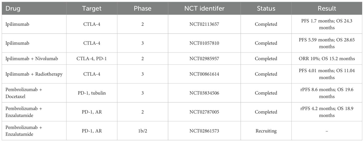 The survival benefit of Sip-T monotherapy remains limited, but further optimization of the regimen is required to balance efficacy and safety. A phase II clinical trial of 54 patients with CRPC demonstrated that IL-7-amplified lymphocyte populations may enhance the immune response to Sip-Tin patients with metastatic desmoplasia-resistant prostate cancer. The study revealed that 31% of patients in the rhIL-7 group achieved a PSA doubling time of more than six months, in contrast to the 14% observed in the observation group (137). The phase II clinical trial (NCT01804465, n=50) demonstrated that Sip-T in combination with the CTLA-4 inhibitor ipilimumab exhibited limited clinical activity in CRPC and that the timing of administration (immediate vs. delayed) did not affect the antigen-specific immune response (138). This indicates a necessity for further exploration of synergistic mechanisms of immunotherapy in the future to enhance the immunotherapeutic benefit of CRPC.
