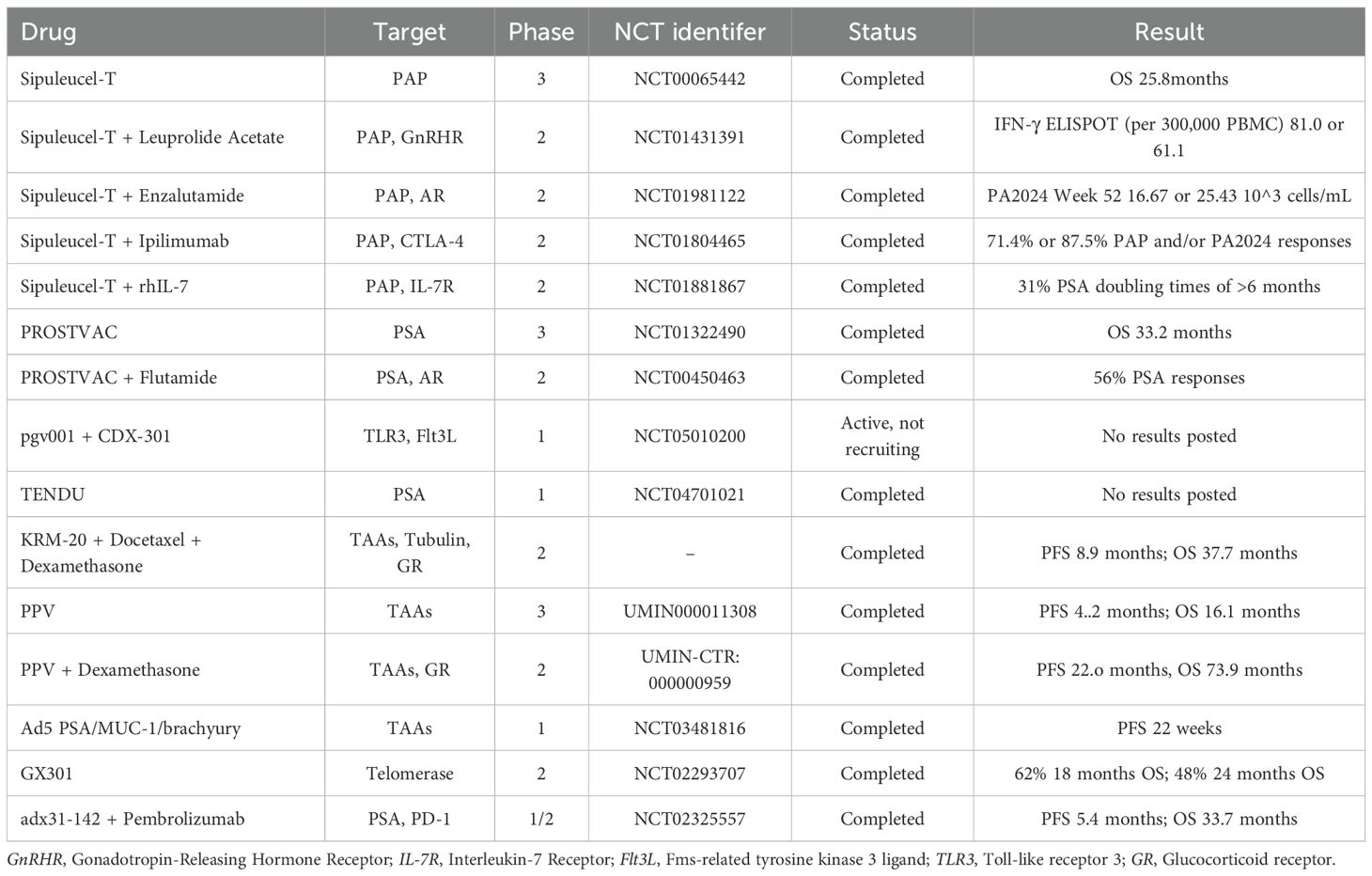 Above all, the mainly tumor vaccines involved in CRPC are summarized in Table 3.