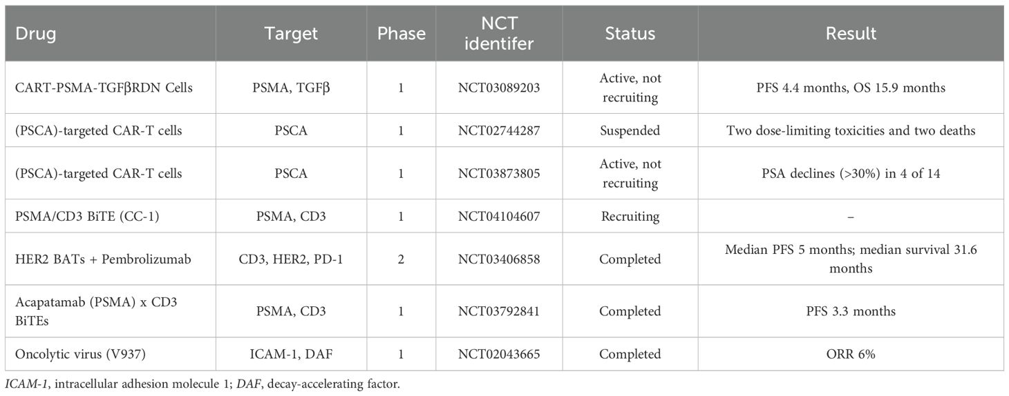 CC-1 is an IgG-derived PSMA/CD3 BiTE for improved dual targeting of tumor cells and vascular cells in PSMA-positive tumors (175). A phase I clinical trial (NCT04104607) is currently underway to evaluate the safety, tolerability, and preliminary efficacy of CC-1 in patients with desmoplasia-resistant prostate cancer. To overcome the immunosuppressive microenvironment and physical barriers specific to prostate cancer, and to avoid possible adverse effects, multi-targeted approaches will be needed in the future to consider the heterogeneity of tumor antigens (176). HER2 BATs represent a class of targeted HER2 tumor antigens, comprising both anti-CD3 and anti-Her2 bi-armed antibodies, and have been shown to elicit substantial immune responses against cancer cells (177). A phase 2 trial combining HER2 BATs with the immunotherapy agent, pembrolizumab, for the treatment of CRPC, enrolled 14 patients, with a primary endpoint of 6-month PFS rate of 38.5% (178). Acapatamab, a PSMA x CD3 bispecific T-cell armature, was shown to have a significant impact on the immune response to CRPC in a 133-patient phase I clinical trial, showing some anti-tumor activity and suggesting it as a potential therapeutic option for patients with CRPC. However, further validation of its survival benefit and long-term safety is required (179).