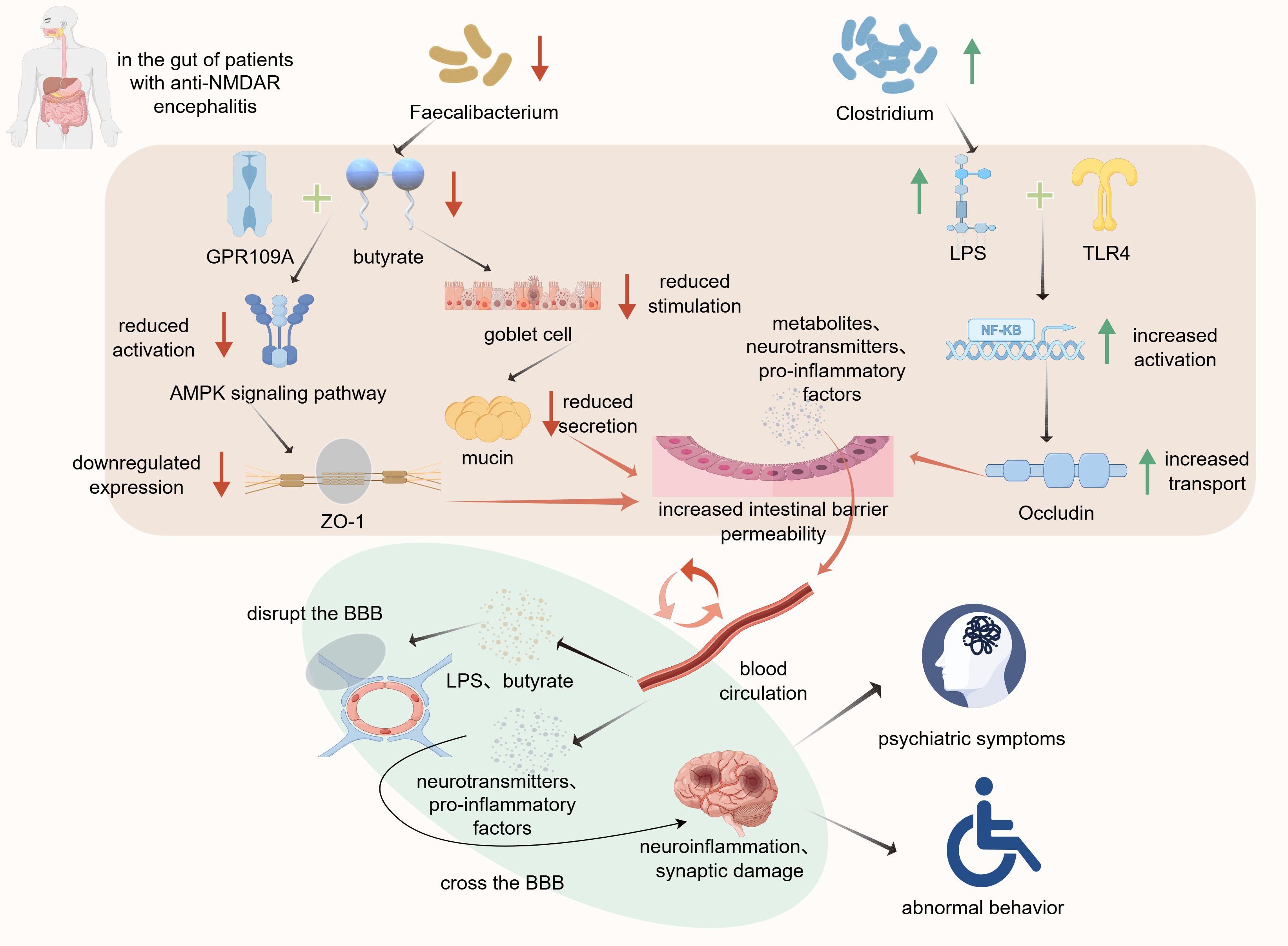 Figure 1. Altered gut microbiota composition contributes to intestinal barrier disruption and exacerbation of anti-NMDAR encephalitis symptoms. By Figdraw. Reduction in the abundance of Faecalibacterium decreases butyrate levels.