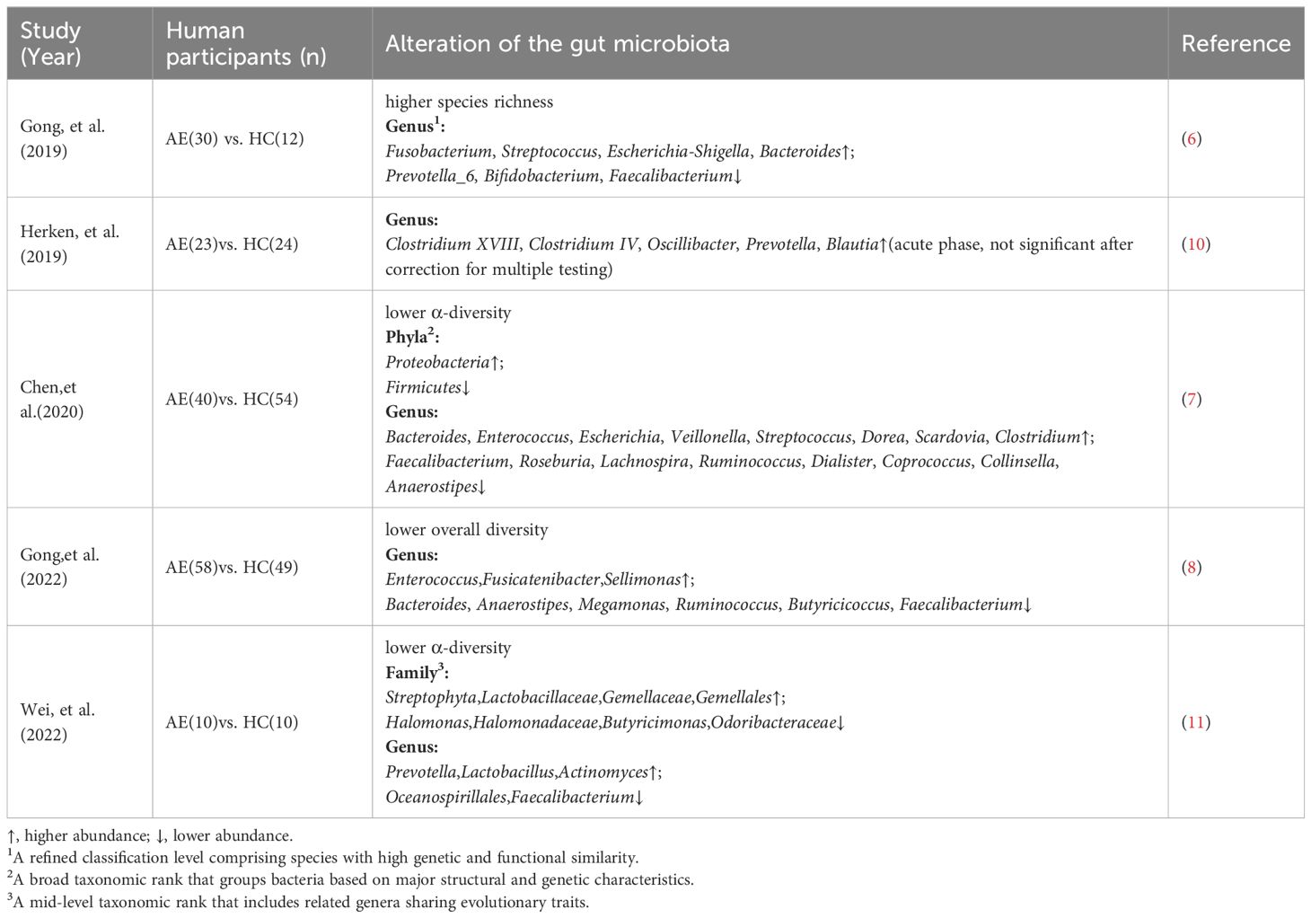 The gut microbiota of patients with anti-NMDAR encephalitis differs from that of healthy individuals. Specifically, newly diagnosed patients with anti-NMDAR encephalitis exhibit reduced fecal microbial diversity compared with healthy controls(Table 1) (7, 8, 11). This reduction in microbial diversity is consistent with observations in various other diseases such as non-alcoholic fatty liver disease, type 2 diabetes mellitus, hypertension and Alzheimer’s disease (14–17). However, Gong et al. reported contrasting findings, detecting higher gut microbiota diversity in patients with anti-NMDAR encephalitis than in healthy controls(Table 1) (6). Greater bacterial diversity is associated with healthier host status, as diverse microbial communities can deplete the nutrients required for pathogens to colonize the gut, thereby protecting the host from exogenous microbial invasion (18). Herken et al. presented a third outcome, indicating no significant difference in gut microbiota diversity between patients with anti-NMDAR encephalitis and healthy controls (10).