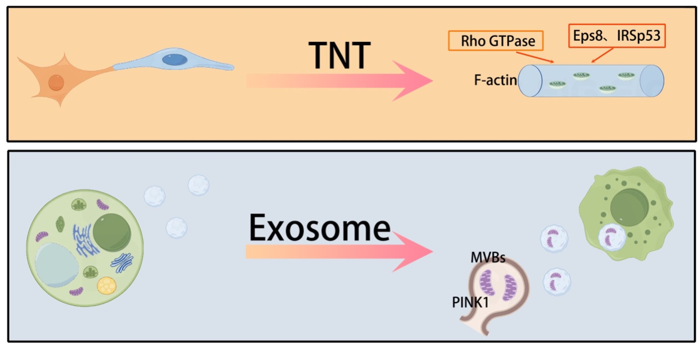 Mitochondrial transfer between cells occurs through multiple pathways, each with distinct mechanisms. One of the main pathways involves TNTs, which are cell membrane extensions with a diameter of 50–1000 nm. These TNTs can establish intercellular connections over distances that span multiple cell diameters in the microenvironment (43). TNTs are rich in F-actin, and their stability relies on the activation of Rho GTPase family proteins (44, 45). Miro1/2, as mitochondrial outer membrane anchor proteins, coordinate the directional migration of mitochondria along microtubules to the TNTs transport site through kinesin (46). Rac1 promotes actin polymerization by activating the WAVE complex, driving the cell membrane protrusion to form the physical structure of the TNTs (47). These mechanisms work together to optimize the efficiency of mitochondrial transfer between cells.