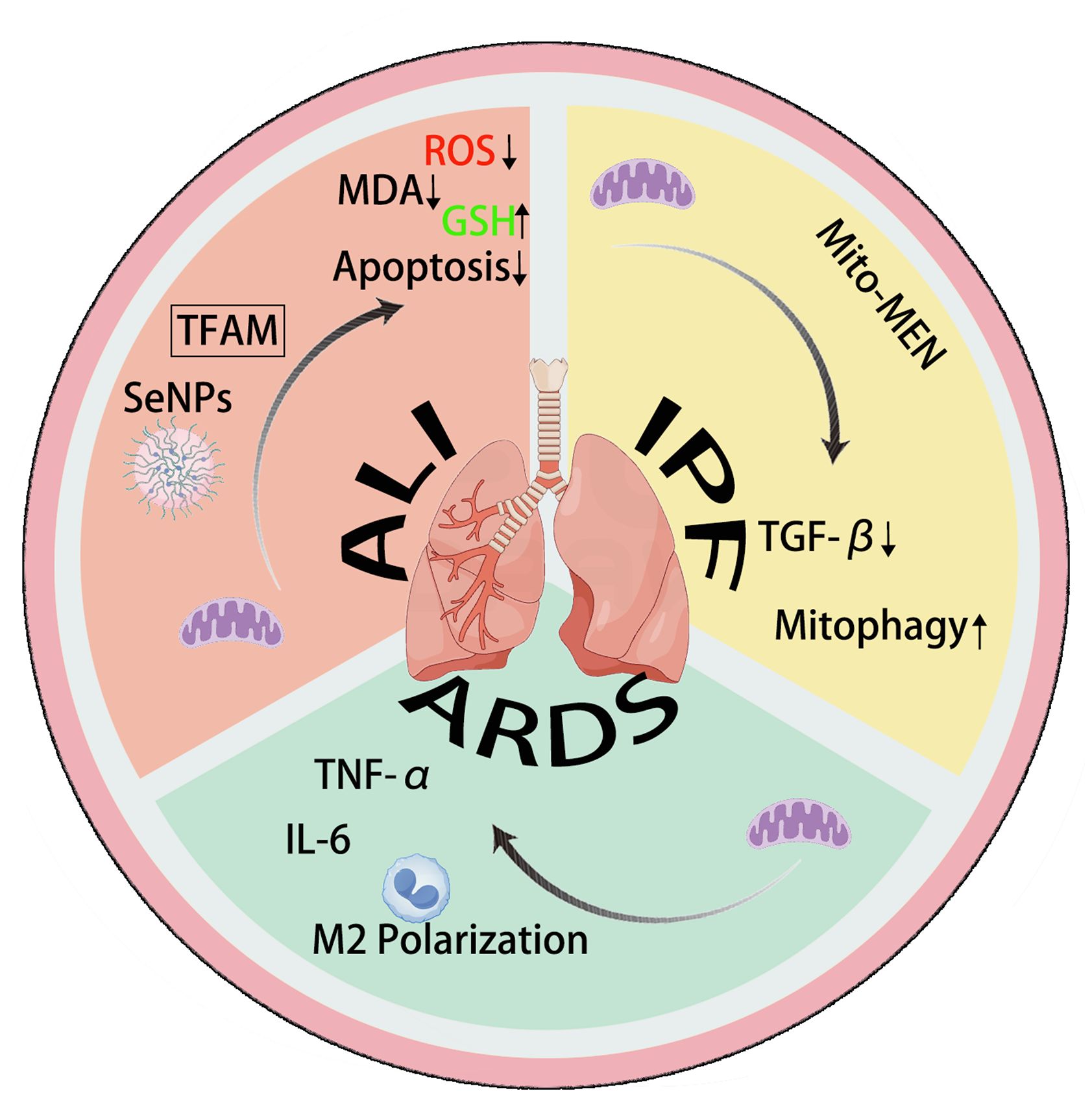 Lung injury is a pathological process caused by multiple factors, including infection, inflammation, ischemia, toxic exposure, and mechanical stress. Based on the progression of the disease, it can be divided into two categories: acute lung injury (ALI)/acute respiratory distress syndrome (ARDS) and chronic lung injury (such as pulmonary fibrosis, chronic obstructive pulmonary disease (COPD) (1–3). These diseases not only significantly affect patients’ quality of life but also impose a substantial medical burden (4–6). ARDS is one of the leading causes of death in intensive care units, with a mortality rate of up to 40%, which is even higher in elderly and immunocompromised individuals (7). The pathological features of ARDS include alveolar-capillary barrier destruction, pulmonary edema, inflammatory cell infiltration, and diffuse alveolar damage. Currently, standard treatments for ARDS mainly include mechanical ventilation, glucocorticoids, and anti-inflammatory drugs (8). However, these methods only alleviate symptoms and cannot reverse the underlying damage to lung tissue. For example, while mechanical ventilation can sustain oxygenation, prolonged use may lead to ventilator-associated lung injury and exacerbate alveolar damage. Although glucocorticoids suppress inflammatory responses, their nonspecific immunosuppressive effects can increase the risk of secondary infections, and they have no significant impact on the fibrosis process (5, 9, 10). In addition, biological therapies targeting specific inflammatory factors have shown limited effects in some patients, highlighting the heterogeneous nature of ARDS and the need for more precise treatment strategies (11). Representative diseases of chronic lung injury include idiopathic pulmonary fibrosis(IPF) and COPD. IPF is a progressive, irreversible interstitial lung disease, with a median survival of only 3–5 years (12). Its pathological features include the abnormal activation of fibroblasts and excessive deposition of extracellular matrix, which ultimately leads to the destruction of lung structure and loss of function. Although anti-fibrotic drugs can slow disease progression, they cannot repair existing scar tissue, and some patients discontinue the medication due to gastrointestinal side effects (13, 14). COPD is a disease characterized by persistent airflow limitation, with major pathological changes, including alveolar wall destruction and airway remodeling. It is the third leading cause of death worldwide, and currently, no cure exists (15). Existing treatments primarily relieve symptoms but do not prevent disease progression. Patients with COPD often experience mitochondrial dysfunction, manifested as reduced ATP production and excessive ROS production, which may contribute significantly to disease progression (16–18). Despite recent advancements in the treatment of lung injury, existing approaches still face numerous challenges. Traditional anti-inflammatory therapies, such as glucocorticoids, can reduce inflammation by broadly suppressing immune responses. However, their non-specific mechanisms of action lead to severe side effects, including osteoporosis, diabetes, and an increased risk of infection with long-term use. Additionally, their effect on slowing pulmonary fibrosis progression is limited, suggesting that inflammation and fibrosis may drive disease progression through distinct mechanisms (19, 20). In the field of stem cell therapy, although mesenchymal stem cells (MSCs) are highly expected for their immunomodulatory and tissue repair abilities, clinical outcomes have shown significant limitations. In addition, the standardization and heterogeneity of stem cell preparations have led to inconsistent results in clinical trials (21–23). In gene and cell therapy, while CRISPR and mRNA-based repair strategies theoretically offer high specificity, they face significant obstacles such as low delivery efficiency and insufficient targeting in practical applications. These limitations have prompted researchers to explore new therapeutic targets. As a key mechanism of lung injury, mitochondrial dysfunction has garnered increasing attention in recent years due to its core role in key pathological processes such as energy metabolism, oxidative stress, and apoptosis. This has opened a new avenue for developing more effective treatments for lung injury (24, 25).
