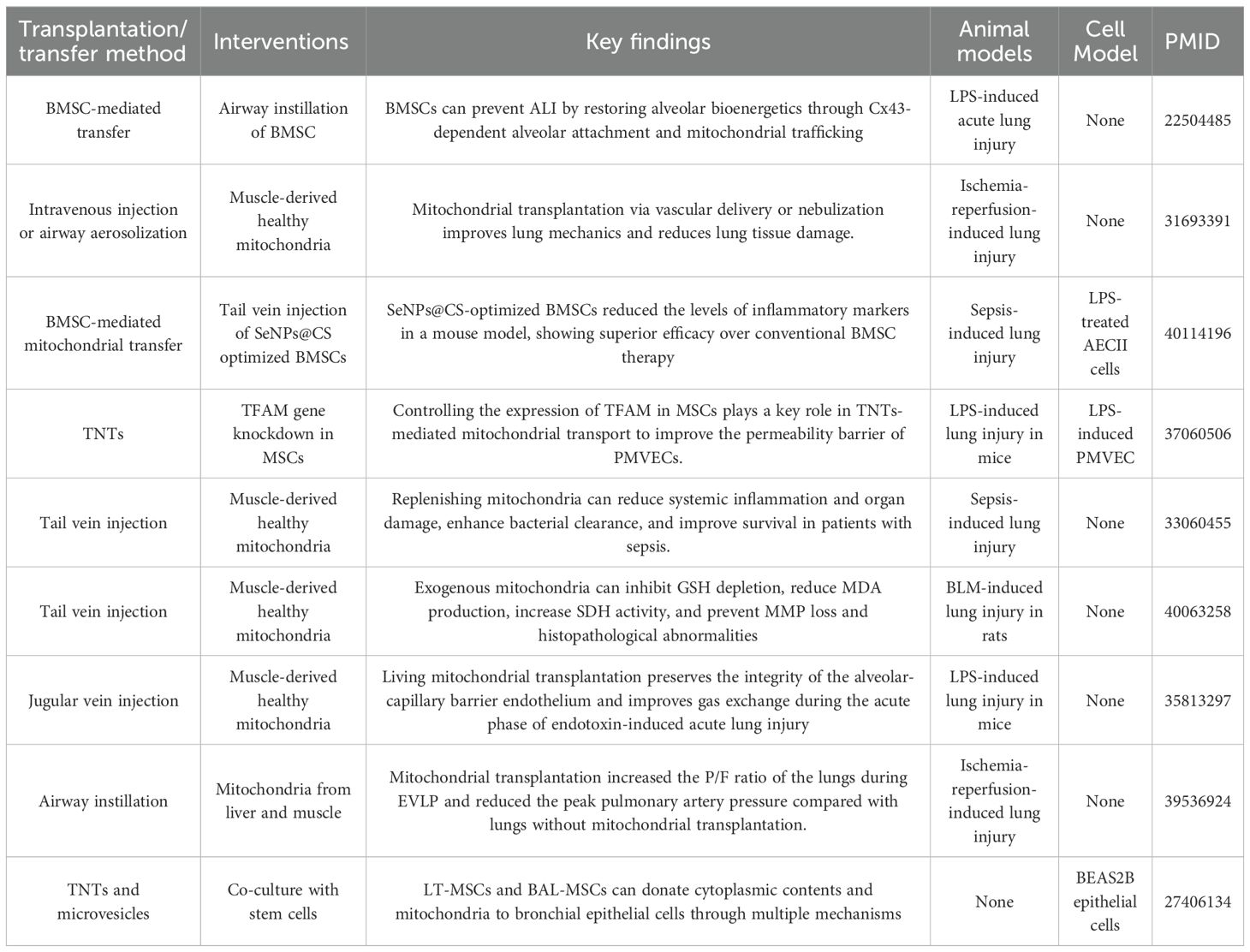 Mitochondrial transfer/transplantation has shown significant therapeutic potential in the repair of lung injury across various disease models. These findings not only confirm the biological effects of mitochondrial transfer/transplantation but also provide insights into its mechanisms of action, laying a strong foundation for clinical application.