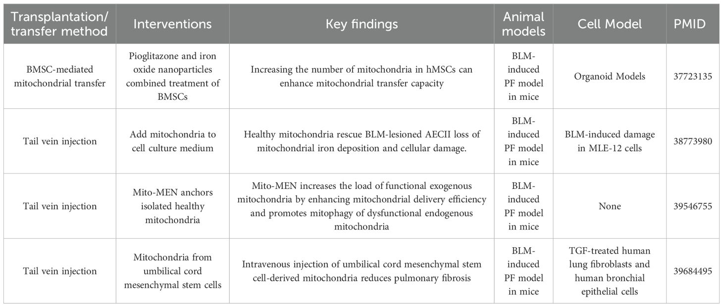 Research on mitochondrial transfer/transplantation in pulmonary fibrosis has shown that regulating mitochondrial homeostasis, improving mitochondrial function, and removing damaged mitochondria can effectively alleviate the fibrotic process. These findings provide a promising new direction for the treatment of pulmonary fibrosis. At the mechanistic level, multiple studies have revealed the close relationship between mitochondrial dysfunction and pulmonary fibrosis. Mitochondrial dysfunction in AECs is a key pathological factor in the progression of pulmonary fibrosis. For instance, Pioglitazone has been shown to activate the PGC1α/NRF1/TFAM pathway, promoting mitochondrial biogenesis in MSCs. Furthermore, iron oxide nanoparticles can enhance mitochondrial delivery, improving the efficiency of mitochondrial transfer. This intervention has been shown to restore mitochondrial function in mouse models to 107.8% of normal levels, activate damaged mitochondrial autophagy, and reduce the accumulation of dysfunctional mitochondria (70). Abnormal mitochondrial iron metabolism is one of the key therapeutic targets in mitochondrial therapy for pulmonary fibrosis. In bleomycin-induced pulmonary fibrosis, the mitochondrial iron transporter MFRN2 is highly expressed in AECs type II (AECII), leading to iron deposition and mitochondrial dysfunction. Activation of the EP4 receptor can promote the ubiquitination and degradation of IREB2 by upregulating FBXL5, thereby inhibiting MFRN2-mediated iron accumulation and improving mitochondrial function (71). Recent advances in cell engineering and nanotechnology have further enhanced mitochondrial transfer efficiency. The Mito-MEN system, developed by Wang et al., uses nanoparticles to deliver Parkin mRNA, improving the efficiency of mitochondrial transfer to damaged cells. This system not only promotes Parkin-mediated mitochondrial autophagy but also reduces collagen deposition and TGF-β secretion in a bleomycin-induced mouse model, leading to a reduction in pulmonary fibrosis scores (72). Mitochondria derived from human umbilical cord MSCs have also been shown to inhibit TGF-β-induced fibroblast activation and epithelial-mesenchymal transition in vitro. In vivo, intravenous injection of these mitochondria in a bleomycin-induced mouse model reduced lung weight gain, inflammatory cell infiltration, and Ashcroft fibrosis scores (41). Mitochondrial transplantation operates through multiple mechanisms: it replenishes functional mitochondria, restores ATP production, reduces ROS levels, and mitigates cell damage by regulating mitochondrial autophagy and iron metabolism (71, 73).Additionally, it inhibits myofibroblast activation and excessive extracellular matrix deposition (41). In summary, mitochondrial transplantation has shown significant potential in the intervention of pulmonary fibrosis by enhancing the supply of functional mitochondria, clearing damaged mitochondria, and regulating key metabolic pathways. These findings provide a solid experimental foundation for the development of therapeutic strategies aimed at restoring mitochondrial homeostasis in pulmonary fibrosis (Table 2).