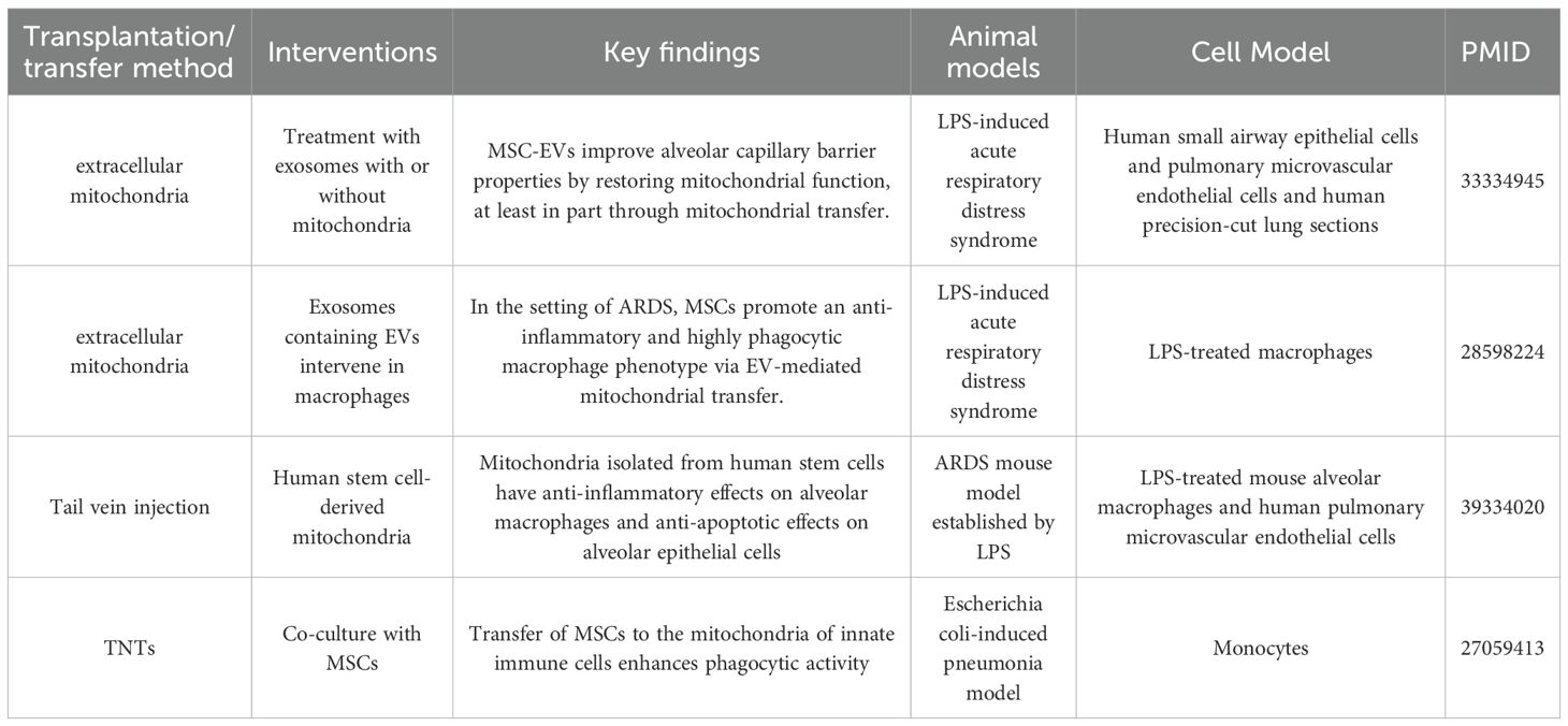 ARDS is an acute lung disease characterized by alveolar-capillary barrier destruction, uncontrolled inflammation, and oxidative stress, with a high mortality rate. Mitochondrial transfer/transplantation presents a promising new potential direction for its treatment. Mitochondrial transfer/transplantation plays a key role in immune regulation in ARDS. Studies have shown that alveolar macrophages are the core mediators of mitochondrial transfer, which allows them to exert both antibacterial and anti-inflammatory effects. If macrophages are depleted, the bacterial clearance ability of MSCs is completely impaired (74). When macrophages acquire mitochondria, their phagocytic ability is significantly enhanced, enabling them to clear bacteria more effectively. Moreover, mitochondrial acquisition leads to macrophage polarization toward the anti-inflammatory M2 phenotype, characterized by the upregulation of M2 markers such as CD206 and the reduced secretion of pro-inflammatory cytokines like TNF-α and IL-6. This, in turn, helps inhibit excessive inflammatory responses (49, 74, 75). In terms of mitochondrial repair of lung tissue, mitochondrial dysfunction in pulmonary microvascular endothelial cells and airway epithelial cells plays a significant role in ARDS pathology. The resulting loss of mitochondrial function leads to increased barrier permeability. By supplementing functional mitochondria, it is possible to restore mitochondrial respiratory function in these cells, improve ATP production, stabilize membrane potential, reduce ROS accumulation, and thus reduce cellular permeability and help repair the alveolar-capillary barrier (40). Additionally, mitochondria play a role in balancing mitochondrial autophagy and biogenesis, preventing excessive autophagy from causing cellular damage, and promoting the restoration of lung tissue homeostasis (40). In vivo experiments further support the therapeutic potential of mitochondrial transfer/transplantation in ARDS. In mouse models of ARDS induced by LPS or bacteria, mitochondrial transplantation significantly reduced inflammatory cell infiltration, lowered protein content and pro-inflammatory factor levels in BALF, and alleviated lung tissue damage (74, 75). Furthermore, transplanting alveolar macrophages pre-treated with mitochondria-containing EVs significantly reduced inflammation in lung tissue and decreased neutrophil infiltration (49). The therapeutic effect of mitochondrial transplantation is also influenced by the inflammatory phenotype of patients with ARDS. The reparative effect is more pronounced in patients with a low-inflammatory phenotype, whereas it is more limited in high-inflammatory environments (40) (Table 3).