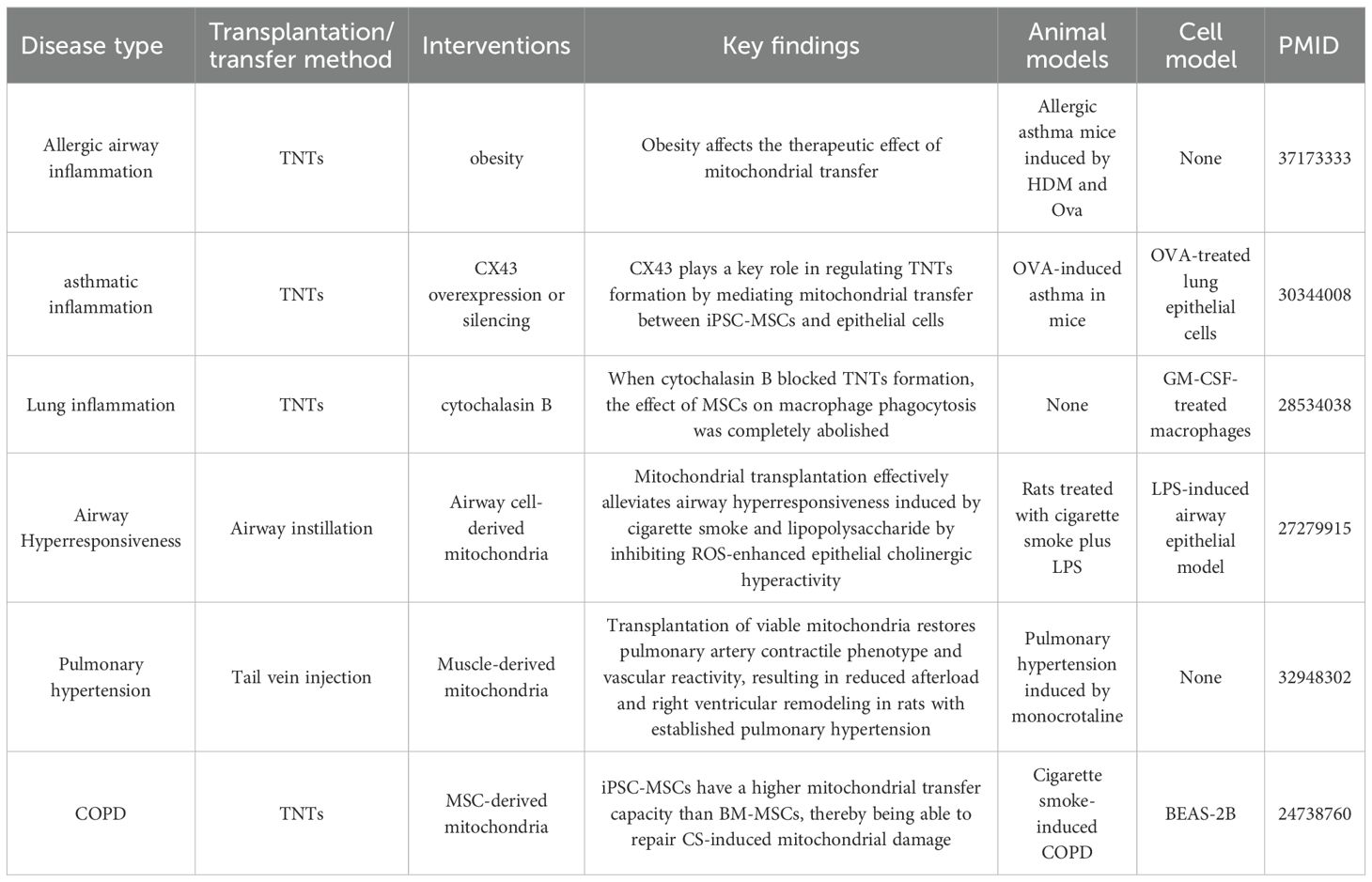 COPD, asthma, airway hyperresponsiveness, and obesity-related allergic airway inflammation are all common lung conditions, characterized by airway inflammation, structural damage, and functional impairment. Mitochondrial transfer/transplantation shows significant therapeutic potential in these diseases by repairing damaged cells, regulating inflammation, and restoring mitochondrial function. In COPD, induced pluripotent stem cell-derived mesenchymal stem cells (iPSC-MSCs) exhibit stronger mitochondrial transfer ability than BM-MSCs. Studies have demonstrated that iPSC-MSCs can transfer functional mitochondria to airway epithelial cells damaged by cigarette smoke through TNTs, significantly restoring cellular ATP levels and reducing alveolar structural damage and fibrosis (76). The efficiency of this transfer is influenced by the damaged microenvironment, with cigarette smoke extracts promoting this process. In addition, iPSC-MSCs have a higher retention rate in the lungs and demonstrate a more significant repair effect compared to BM-MSCs. For airway hyperresponsiveness, mitochondrial transplantation has been shown to reverse cholinergic hyperactivity induced by the combination of cigarette smoke and lipopolysaccharide. Exogenous mitochondria reduce ROS production in airway epithelial cells, inhibit the sensitivity of M3 receptors, reduce the contractile response of the airway to acetylcholine, and improve the frequency of ciliary beating. These effects help reduce mucus secretion and inflammatory infiltration (77). A key mechanism of this process is mitochondrial transfer mediated by Cx43. iPSC-MSCs can transfer mitochondria to damaged airway epithelial cells through TNTs, and overexpression of Cx43 enhances TNTs formation and transfer efficiency. This significantly reduces the release of Th2 cytokines (IL-4, IL-5), restores mitochondrial membrane potential, and alleviates airway inflammation and mucus secretion (78). In contrast, silencing Cx43 impairs the therapeutic effect of mitochondrial transfer. In obesity-related allergic airway inflammation, MSCs derived from obese individuals (MSC-Ob) exhibit impaired mitochondrial transfer capacity due to mitochondrial dysfunction, characterized by cristae damage, ROS accumulation, and reduced cardiolipin content. However, Pyrroloquinoline quinone can enhance the mitochondrial transfer of MSC-Ob to airway epithelial cells by restoring cardiolipin-dependent mitochondrial autophagy. This treatment reduces Th2 cytokine levels and alleviates airway hyperresponsiveness (79). Moreover, when cytochalasin B is used to block TNTs formation, MSC-mediated mitochondrial transfer is completely inhibited (80). In vivo experiments have confirmed that mitochondrial transfer improves bacterial clearance and reduces pro-inflammatory factors such as TNF-α and IL-6. This mechanism underlies the antibacterial and anti-inflammatory effects of MSCs. Overall, mitochondrial transfer/transplantation shows therapeutic potential in various lung diseases by repairing damaged cell energy metabolism and regulating inflammatory pathways. The efficiency of mitochondrial transfer/transplantation is influenced by factors such as cell source, microenvironment, and molecular regulation, providing a basis for therapies targeting mitochondrial homeostasis (Table 4).