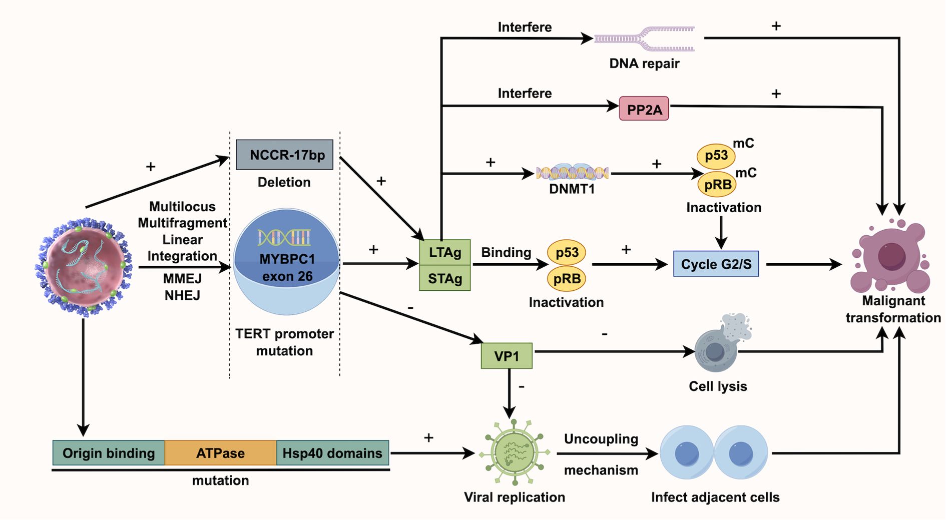 KTRs face a higher risk of viral infections due to immunosuppressive therapy, which may contribute to UC development (39). Human polyomavirus (HPyV), a non-enveloped double-stranded DNA virus, can integrate into the host genome, causing cell cycle disruptions and gene mutations, thereby increasing UC risk (34). BK polyomavirus (BKPV), a common HPyV, usually remains latent in healthy individuals but can reactivate and replicate in KTRs due to prolonged immunosuppressive treatment (40, 41). BKPV’s carcinogenic mechanism may involve its encoded Large T Antigen (LTAg), which can bind to and inactivate the host’s tumor suppressor genes p53 and pRB, resulting in unchecked cell cycle progression and tumor development (42). Chu YH et al. discovered that TAg-positive UC exhibited BKPV integration and higher levels of p16 and p53 compared to TAg-negative UC. Additionally, TAg-positive UC was more likely to present at advanced stages (50% T3-T4), associated with lymph node metastasis (50%), and had a higher UC-specific mortality rate (50%) (43). Kenan DJ et al. discovered that in KTRs with high-grade UC, BKPV disrupts VP1 protein expression and viral replication, meanwhile, deletions occur in the non-coding control region (NCCR). They suggest BKPV contributes to UC by disrupting cell cycle regulation and enhancing genetic instability (44). According to Yan L et al., all instances of polyomavirus-positive UC appeared more than 9 years following transplantation, indicating that the ‘time lapse’ could significantly influence polyomavirus-associated UC and calls for continuous observation (7). Jin Y et al. studied BKPyV integration in the bladder cancer of KTRs using whole-genome and viral capture sequencing. They identified a unique multi-site, multi-fragment linear integration pattern, unlike earlier models, possibly involving microhomology end joining (MMEJ) and nonhomologous end joining (NHEJ). The number of integration sites might correlate with tumor invasiveness, suggesting that monitoring viral load could help prevent related cancers (45). Figure 2 illustrates the BKPV’s mechanism of action. Besides, John cunningham virus (JCV) is believed to be linked to UC. While its carcinogenic role in the general population isn’t fully established, case reports in KTRs suggest JCV’s involvement in UC, as JCV DNA is frequently found in tumor tissues and is closely associated with tumor development (46). It should be noted that much of the current evidence on the roles of BKPV and JCV in carcinogenesis is primarily drawn from studies of bladder cancer rather than urothelial carcinoma more broadly.