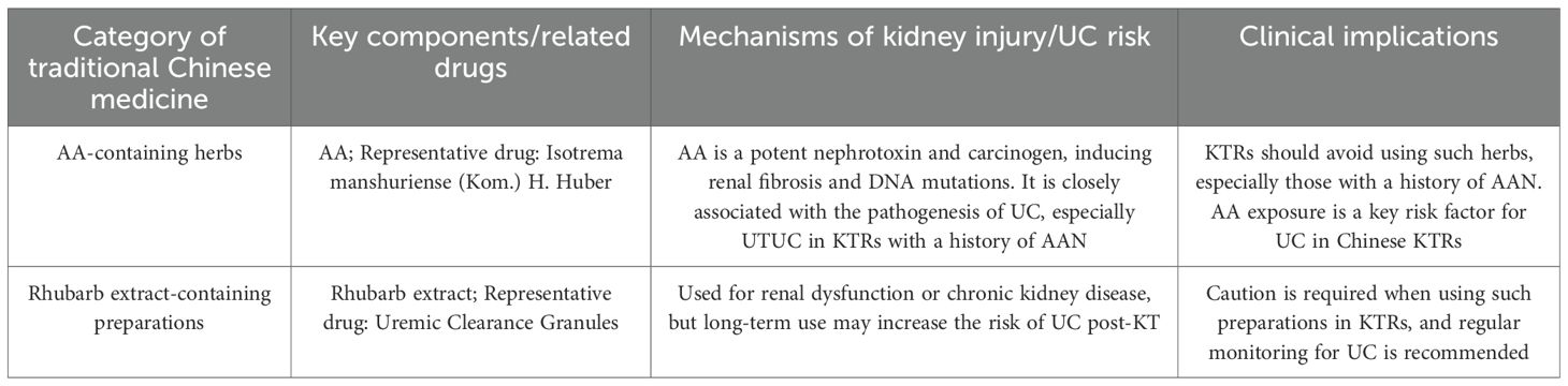 Aristolochic acid (AA) is a potent human nephrotoxin and carcinogen that plays a key role in the pathogenesis of renal fibrosis and UC, often found in traditional Chinese medicine for digestion and weight loss. It’s also used in ESRD patients to reduce serum creatinine (30). AA exposure may explain the higher rates of UC post-transplant in the Chinese population (25, 31), especially among KTRs with a history of Aristolochic Acid Nephropathy (AAN), who face a greater risk of primary kidney UTUC (32). Traditional Chinese medicines with AA, like Isotrema manshuriense (Kom.) H. Huber, may raise UC risk in KTRs. KTRs should be cautious about herbal ingredients’ impact on kidney function and cancer risk, particularly those with AA. In addition, Rhubarb extracts are also key components in certain traditional formulations, like uremic clearance granules. It is mainly used for renal dysfunction or chronic kidney disease, and may also cause UC post KT. Thus, overlooking other Chinese herbal products is unwise, as they too can have serious effects (23, 33), as shown in Table 1. In western countries, the etiological factor of Chinese herbal medicine intake is rarely mentioned. Instead, the common etiological factors for UC after renal transplantation in these countries are more closely associated with the use of immunosuppressants, abuse of analgesics, and other related factors. The impact of Chinese herbal medicine intake on the development of this cancer is far less significant than that in China (23).