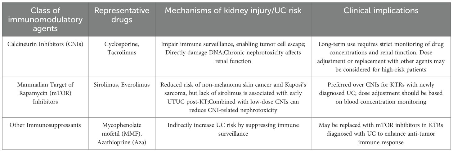 Hu XP et al. assessed the safety and effectiveness of combining rapamycin (RPM) with low-dose CNI in 15 KTRs with UC. The regimen replaced mycophenolate mofetil (MMF) or azathioprine (Aza) with RPM, adjusting doses to maintain 4–6 μg/L blood levels, and reduced CNI doses to one-third after stabilization. All patients received surgical treatment and intravesical chemotherapy. Over two years, 9 patients had no tumor recurrence, 2 had two recurrences, and 4 had one. No acute rejection occurred, with hyperlipidemia and thrombocytopenia as common side effects. This approach appears to inhibit tumor growth, enhance graft function, and reduce cyclosporine nephrotoxicity, showing promising safety and efficacy (104). Combining mTOR inhibitors with tacrolimus regimens lowers the risk of UC post KT (105). However, Besarani et al. found that altering or stopping immunosuppressive therapy alongside chemotherapy offers limited benefits for patients with metastatic disease post KT (106).