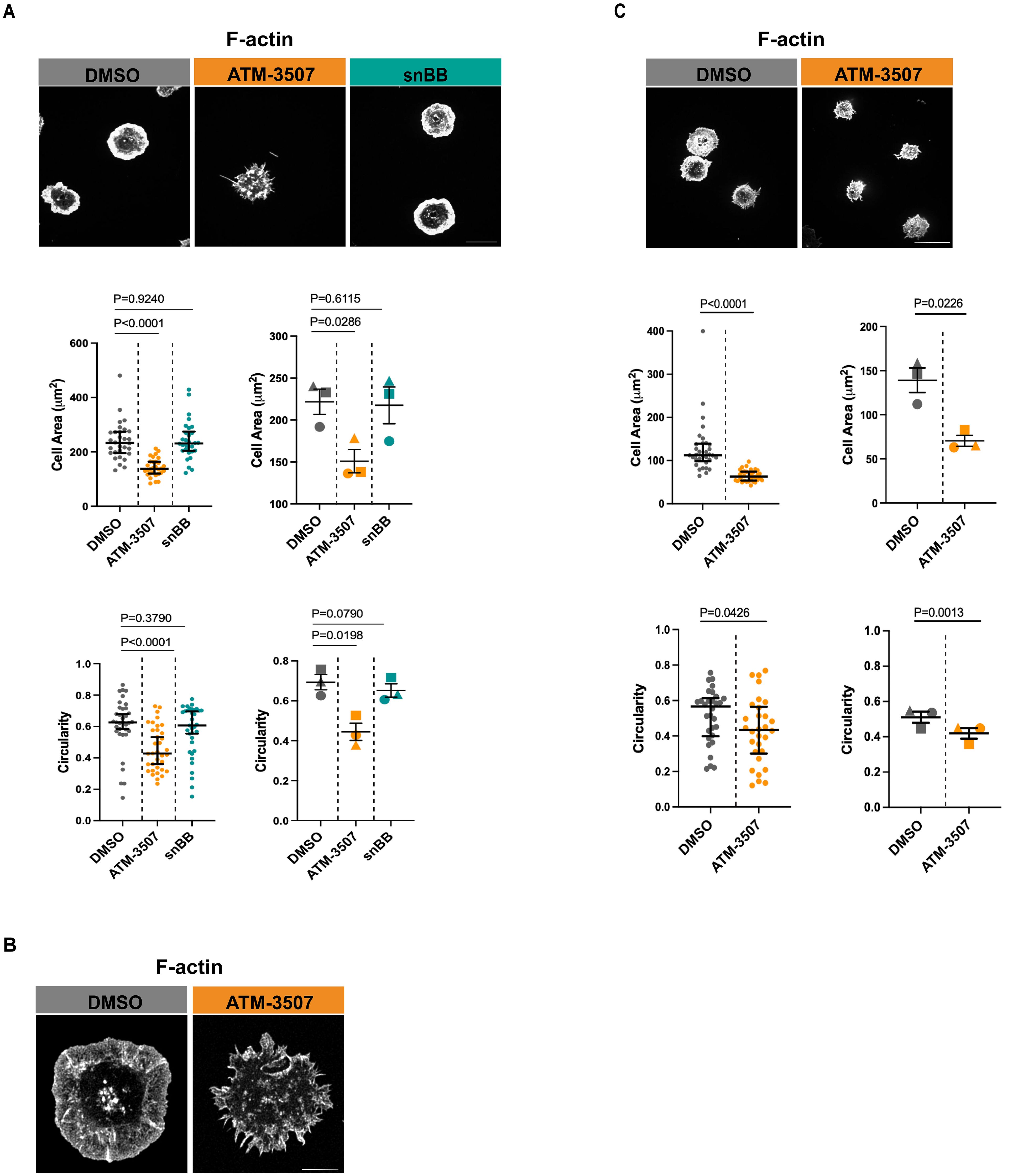 Fluorescent imaging and scatter plots comparing cell area and circularity. Panel A shows F-actin staining of cells treated with DMSO, ATM-3507, and snBB. Scatter plots display statistical comparisons of cell area and circularity. Panel B highlights F-actin differences between DMSO and ATM-3507 treatment. Panel C shows F-actin images with corresponding plots for cell area and circularity between DMSO and ATM-3507. Statistical significance is indicated by p-values in each graph.