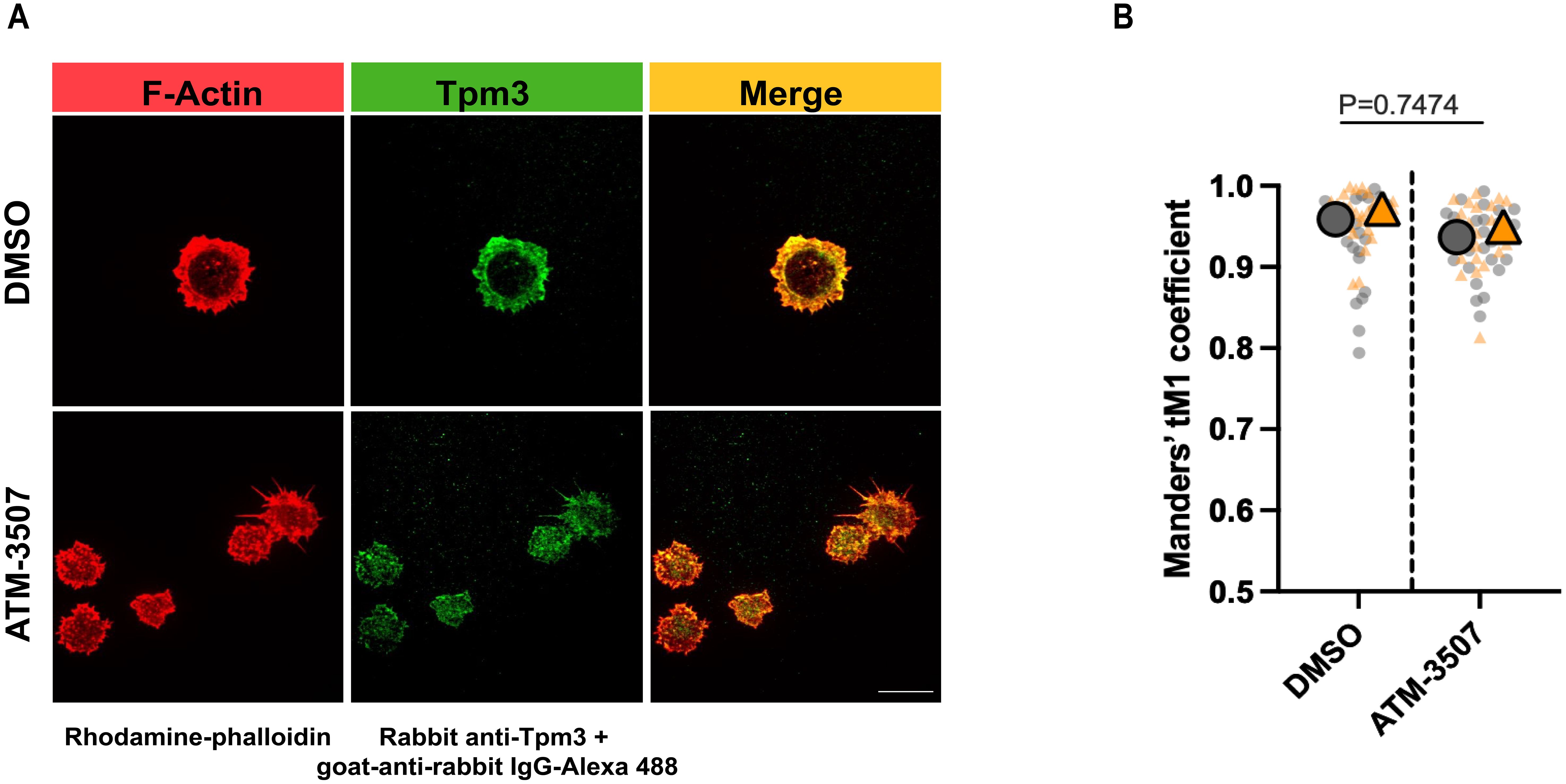 Panel A shows confocal images of cells stained for F-Actin (red), Tpm3 (green), and a merged image, comparing DMSO and ATM-3507 treatments. Panel B is a scatter plot showing Manders' tM1 coefficients for DMSO and ATM-3507 with a P-value of 0.7474, indicating no significant difference.