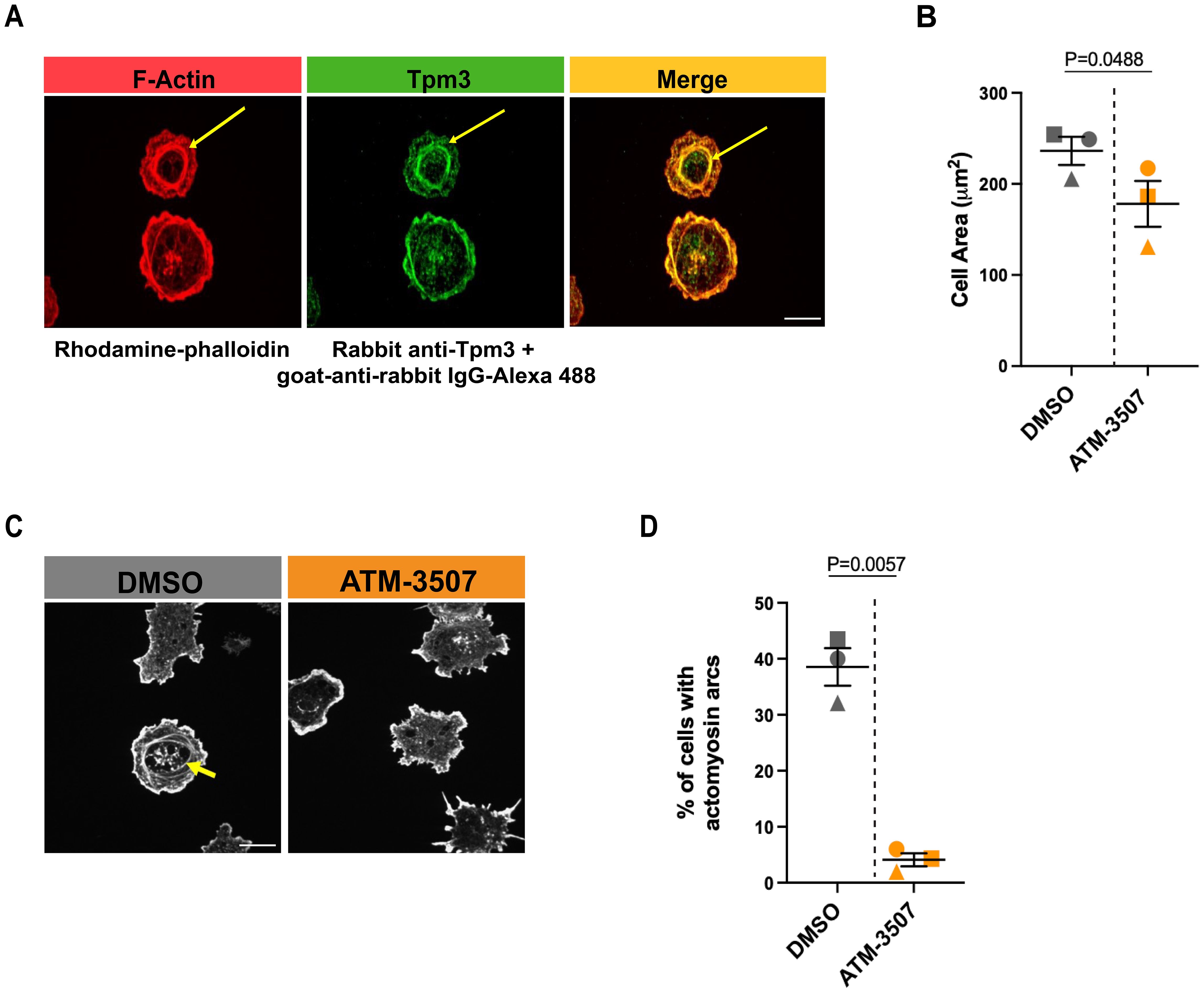 Panel A shows fluorescence microscopy images of F-Actin and Tpm3 staining with a merged image. Panel B is a graph comparing cell area between DMSO and ATM-3507 treatments, showing a significant decrease in cell area with ATM-3507. Panel C presents microscopy images comparing cell morphology under DMSO and ATM-3507. Panel D is a graph showing a significant reduction in the percentage of cells with actomyosin arcs when treated with ATM-3507 compared to DMSO.