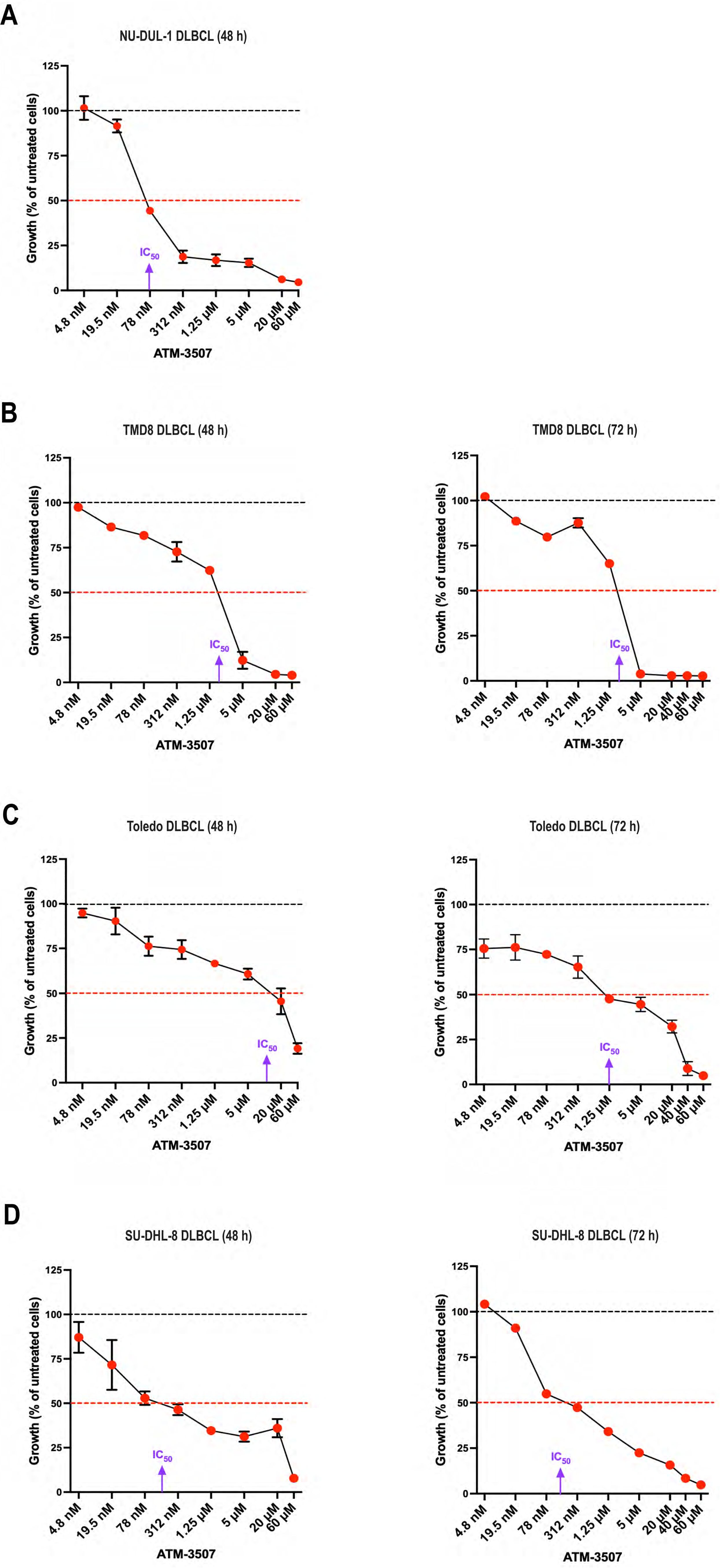 Figure 4. ATM-3507 inhibits the growth of DLBCL cell lines. NU-DUL-1 (A), TMD8 (B), Toledo (C), or SU-DHL-8 DLBCL cells (D) were cultured for 48 h or 72 h with the indicated concentrations of ATM-3507. The Alamar Blue assay was used to measure metabolic activity. In each experiment, each condition was analyzed in triplicate wells (technical replicates), and the mean value was used for data analysis. The data are expressed as a percent of the metabolic activity for cells cultured in the absence of ATM-3507 (control; dotted black lines). Each symbol is the average ± range or the mean ± SEM from 2 or 3 independent experiments. Where no error bars are shown, they were smaller than the symbol. The dotted red lines indicate 50% inhibition. Approximate IC50 values are shown. DMSO concentrations equivalent to those for the highest ATM-3507 concentrations had no effect on metabolic activity.