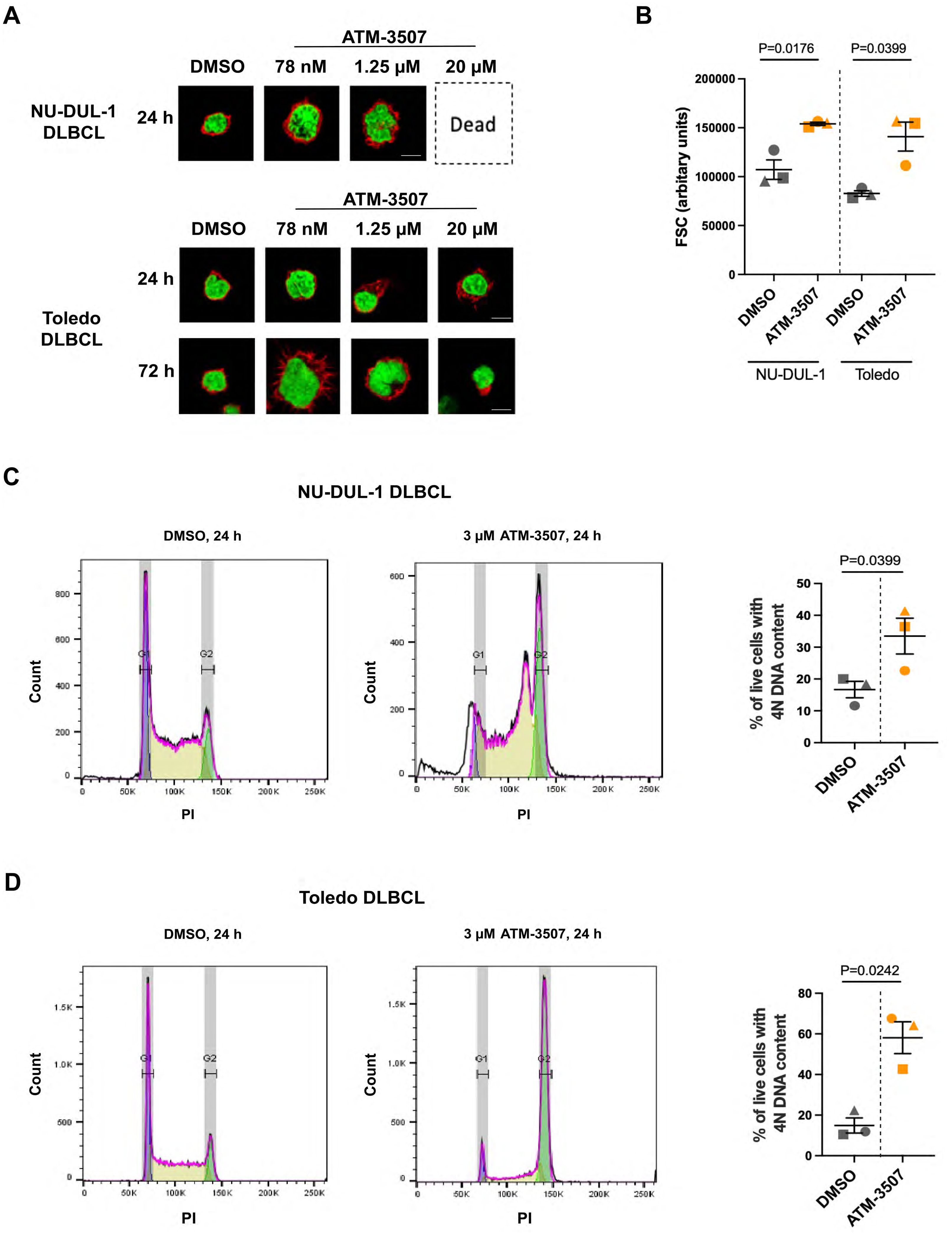 Figure 5. ATM-3507 causes G2/M cell cycle arrest in DLBCL cells. (A) NU-DUL-1 or Toledo cells were cultured with 0.03% DMSO or the indicated concentrations of ATM-3507 for 24 h or 72 h before being stained with rhodamine-phalloidin and DAPI. Cells were imaged by confocal microscopy. Representative images are shown. (B) NU-DUL-1 or Toledo cells were cultured for 24 h with 3 µM ATM-3507 or 0.03% DMSO before being analyzed by flow cytometry. Single live cells were identified by FSC, side scatter, and 7-AAD staining. Geometric means of the FSC values from 3 independent experiments are shown along with the mean ± SEM. (C, D) Propidium iodide (PI) staining was used to quantify the DNA content of live NU-DUL-1 (C) or Toledo (D) cells. Representative histograms showing peaks corresponding to cells with 2N or 4N DNA content. The graphs show the percent of live cells with 4N DNA content. Each symbol is an independent experiment, and the data are presented as the mean ± SEM from 3 experiments. p-values were calculated using two-tailed paired t-tests.