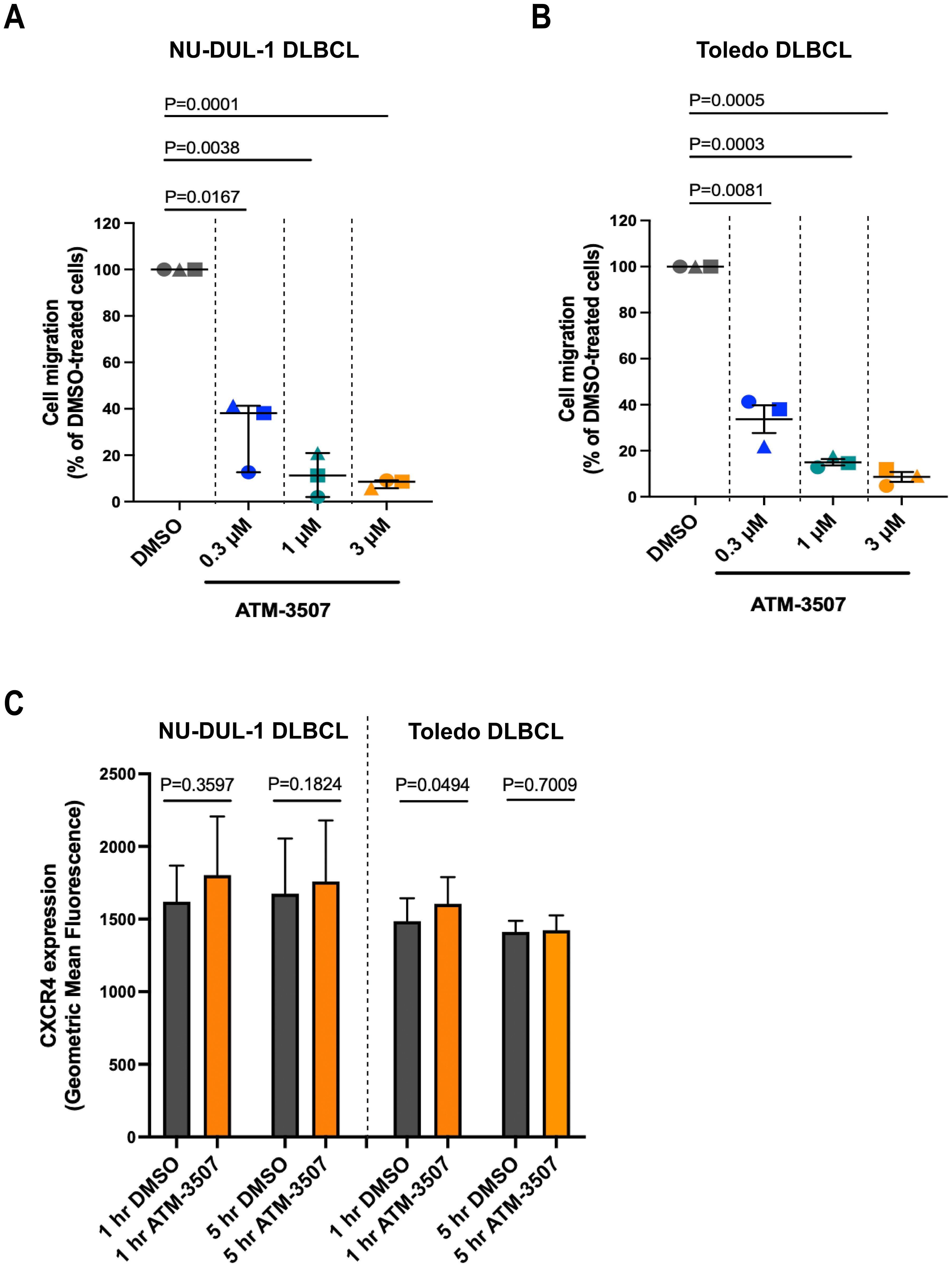 Figure 6. ATM-3507 inhibits the migration of DLBCL cells toward CXCL12. (A, B) NU-DUL-1 or Toledo cells were pre-treated with ATM-3507 or 0.03% DMSO (equivalent to the highest ATM-3507 concentration) for 1 h before being added to the upper chamber of a Transwell. The lower chamber contained 100 nM CXCL12 plus the same concentration of ATM-3507 or DMSO as in the upper chamber. After 4 h, the number of cells that had migrated into the lower chamber was determined using flow cytometry. The data are expressed as a percent of the number of DMSO-treated cells that migrated into the bottom chamber. The 100% values (percent of DMSO-treated cells that migrated into the lower chamber) in individual experiments ranged from 15-30% for NU-DUL-1 cells and from 50-70% for Toledo cells. Each symbol is an independent experiment. Means ± SEM are shown for 3 independent experiments. (C) NU-DUL-1 or Toledo cells were treated with 3 µM ATM-3507 or 0.03% DMSO for 1 h or 5 h before quantifying cell surface levels of CXCR4 by flow cytometry. Means ± SEM are shown for 3 independent experiments. p-values were calculated using two-tailed paired t-tests.