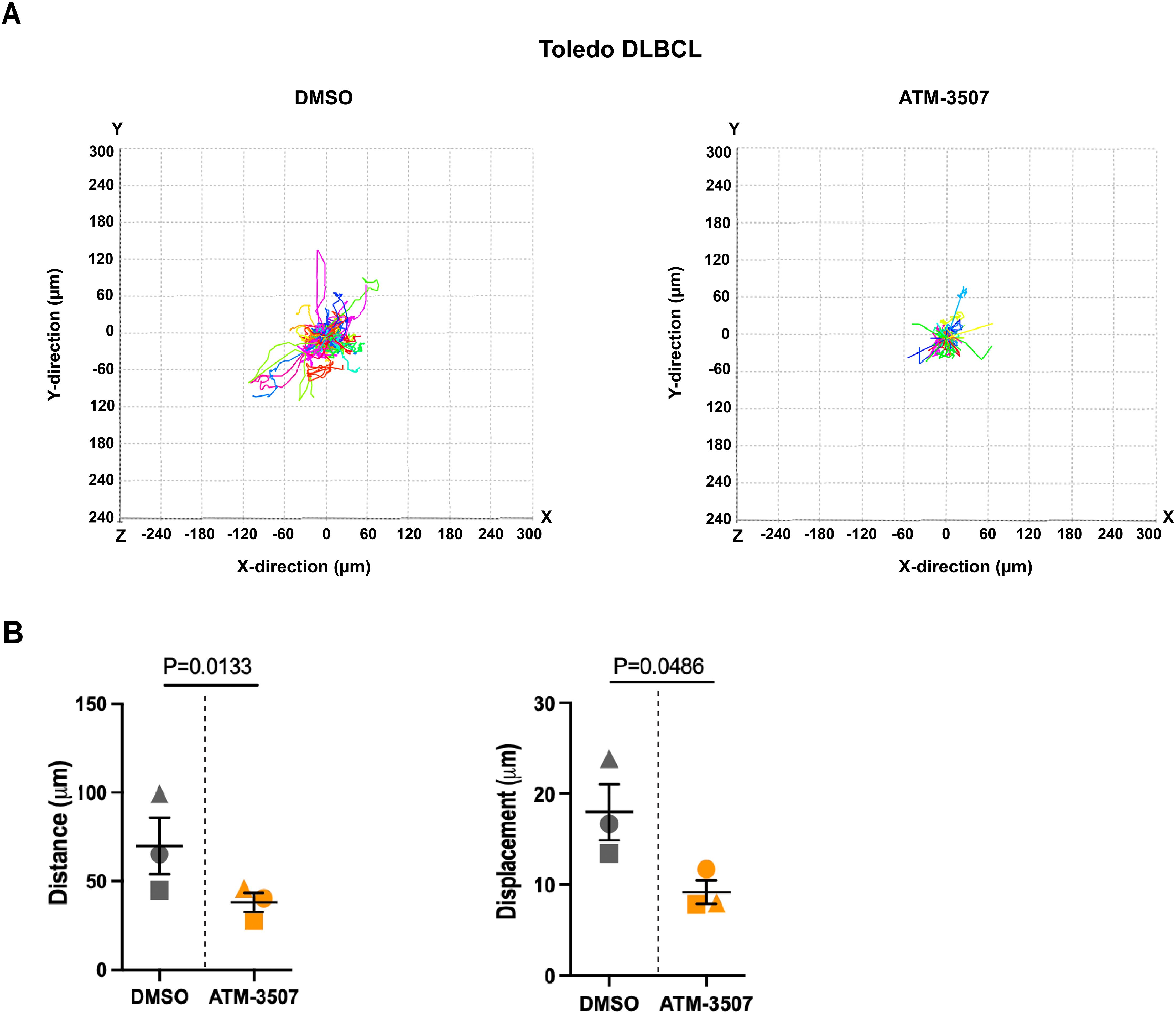 Two panels show data on Toledo DLBCL cells. Panel A contains movement trajectories in X and Y directions under DMSO (left) and ATM-3507 (right) treatment, with more confined movement in ATM-3507. Panel B presents bar graphs comparing distance and displacement between DMSO and ATM-3507, showing reduced values for ATM-3507. Significant differences are indicated with p-values of 0.0133 and 0.0486, respectively.