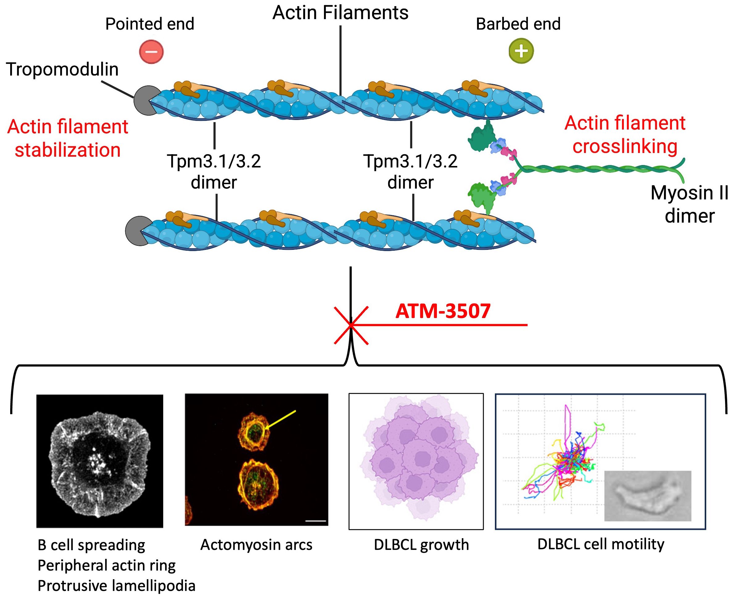 Results: We show that ATM-3507 treatment inhibited B-cell receptor-induced formation of the peripheral ring of branched actin that drives cell spreading and also prevented the formation of actomyosin arcs at the inner face of the peripheral actin ring. Tpm3.1/3.2 localizes to these structures during B-cell spreading. Treating DLBCL cell lines with ATM-3507 inhibited cell growth and caused the cells to accumulate in the G2/M phase of the cell cycle. Furthermore, ATM-3507 markedly reduced CXCL12-stimulated chemotaxis and integrin-dependent motility of DLBCL cell lines on fibronectin.