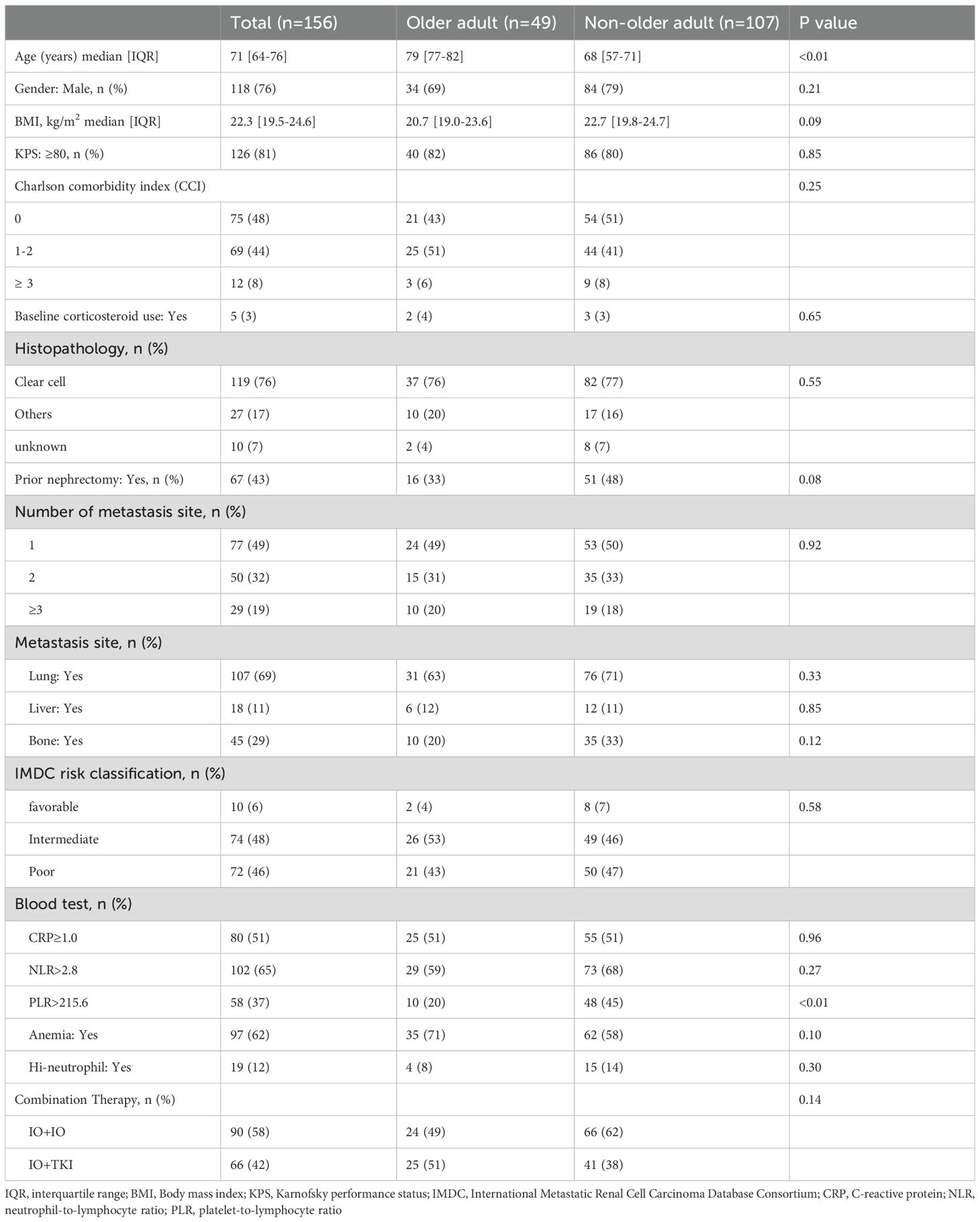 Methods: We retrospectively enrolled 156 patients with mRCC who received first-line IO+IO or IO+TKI between September 2018 and June 2024 at eight Japanese institutions. Patients were categorized into an older adult group (≥ 75 years, n=49) and a non-older adult group (< 75 years, n=107). We evaluated objective response rate (ORR), disease control rate (DCR), progression-free survival (PFS), overall survival (OS), and adverse events (AEs).
