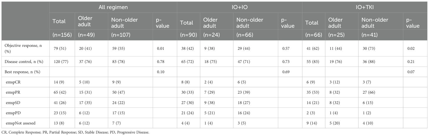 We compared IO+IO and IO+TKI separately and analyzed the data. In the IO+IO regimen, ORR (39% vs. 46%, p=0.57) and DCR (76% vs. 78%, p=0.73) did not differ significantly between the two regimens. In contrast, the ORR (55% vs. 81%, p=0.04) in the IO+TKI regimen was significantly lower in the older adult group. In the older adult group, the response rates of IO+IO and IO+TKI were comparable (ORR: 39% vs. 55%, p=0.30; DCR: 78% vs. 95%, p=0.11).