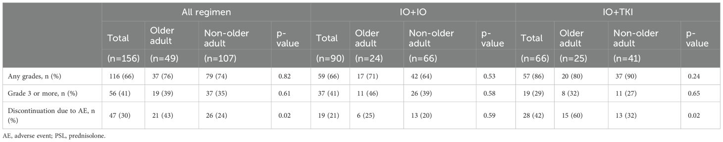 The Ethics Review Board of the Nagoya City University Graduate School of Medical Sciences approved this study (Approval Number: 60-19-0196), and it was conducted in accordance with the guidelines of the Declaration of Helsinki. In this retrospective study, we enrolled 156 patients diagnosed with mRCC who received first-line IO+IO or IO+TKI therapy between September 2018 and June 2024 at Nagoya City University Hospital and seven affiliated institutions. We classified patients aged ≥ 75 years as the older adult group and those aged < 75 years as the non-older adult group using a previous report showing that the global median age at diagnosis of kidney cancer is 75 years (15). RCC diagnosis was confirmed by experienced pathologists through histological analysis. The choice of ICI-based combination therapy was made after discussion between the attending physician and other urologists, and after considering patient characteristics using the International Metastatic Renal Cell Carcinoma Database Consortium (IMDC) risk classification. All favorable-risk patients were assigned to IO+TKI therapy. Informed consent was obtained from all patients, and treatment regimens were determined with their full agreement. Baseline and on-treatment assessments included medical history, demographic and physical examinations, Karnofsky Performance Status (KPS), age-unadjusted Charlson Comorbidity Index (CCI) (16), and blood and urine tests, all conducted at the discretion of the attending physician. Treatment response after initiating ICI-based combination therapy was assessed according to the Response Evaluation Criteria in Solid Tumors version 1.1 (17) at physician-scheduled intervals. Toxicity was graded using the Common Terminology Criteria for Adverse Events version 5.0. Adverse events (AEs) occurring within the first two months after treatment initiation were specifically used in the analysis. Blood test values were obtained on the day before or the day of treatment initiation. The dosage and duration of TKI administration were assessed in all the patients undergoing IO+TKI treatment. Relative dose intensity (RDI) was calculated as the ratio of the actual administered dose to the planned maximum dose from treatment initiation to discontinuation.