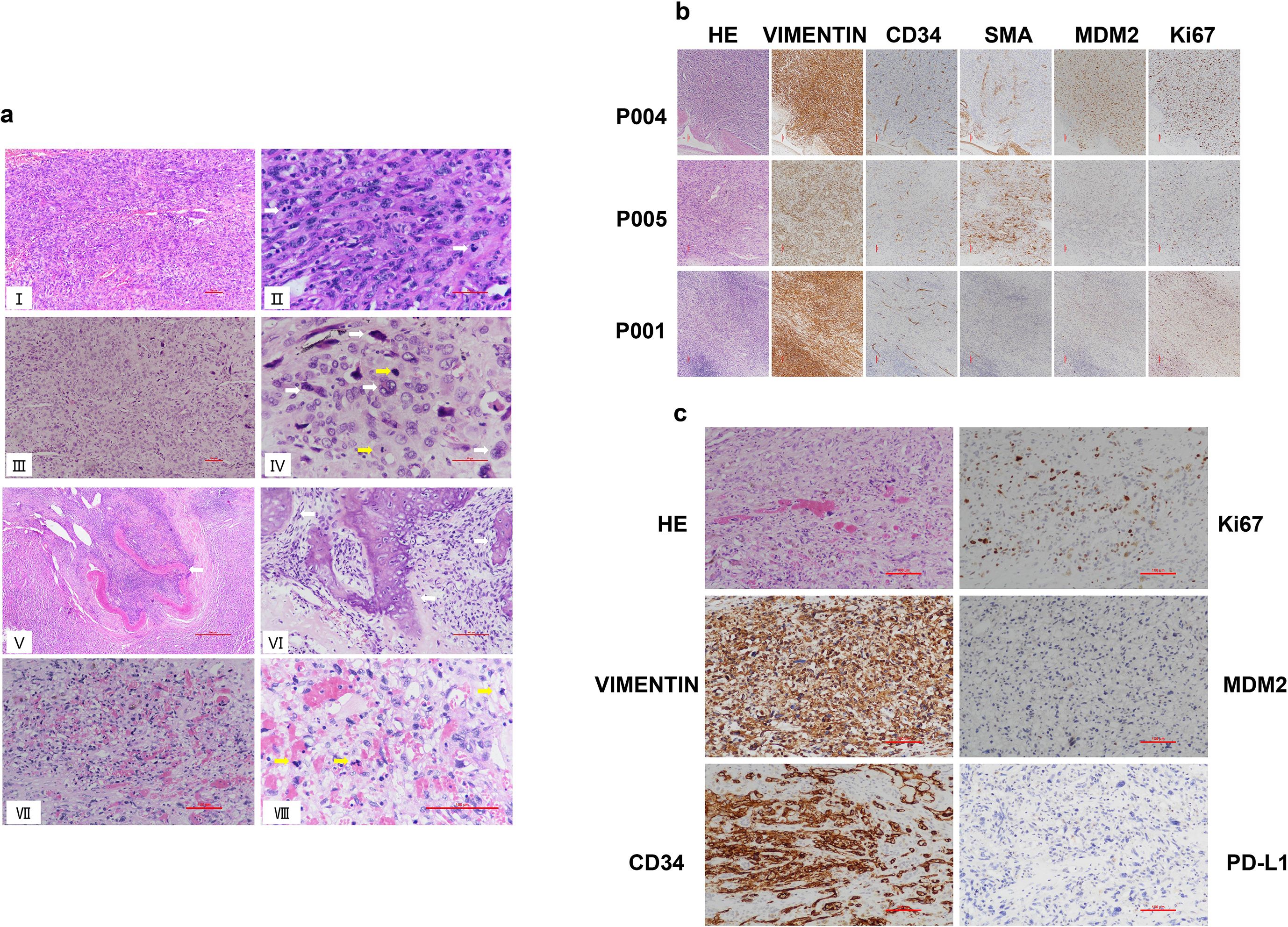 Primary antibodies were sourced as follows: CKpan (AE1/AE3), Vimentin (VMAB159), CD34 (EP88), Ki-67 (MIB-1), CD8 (SP16), and CD4 (EP204) from Beijing Zhong Shan - Golden Bridge Biological Technology Co., Ltd. (Beijing, China); SMA (1H4), CD3 (MX036), CD68 (Kp-1), MDM2 (IF2), and CDK4 (EP180) from Fuzhou Maixin Biotechnology Development Co., Ltd. (Fuzhou, China); PD-L1 (22C3) from Dako North America, Inc.; CD3 (L26) along with all secondary antibodies and reagents from Roche Diagnostics (Shanghai) Co., Ltd. Protein localization analyses were performed using established subcellular compartment criteria: nuclear staining for MDM2 and Ki-67; cytoplasmic staining for SMA, CKpan, CD3, CD8, CD4, CD68, and Vimentin; exclusive plasma membrane staining for PD-L1; combined cytoplasmic and plasma membrane staining for CD34; and cytoplasmic/nuclear dual localization for CDK4.