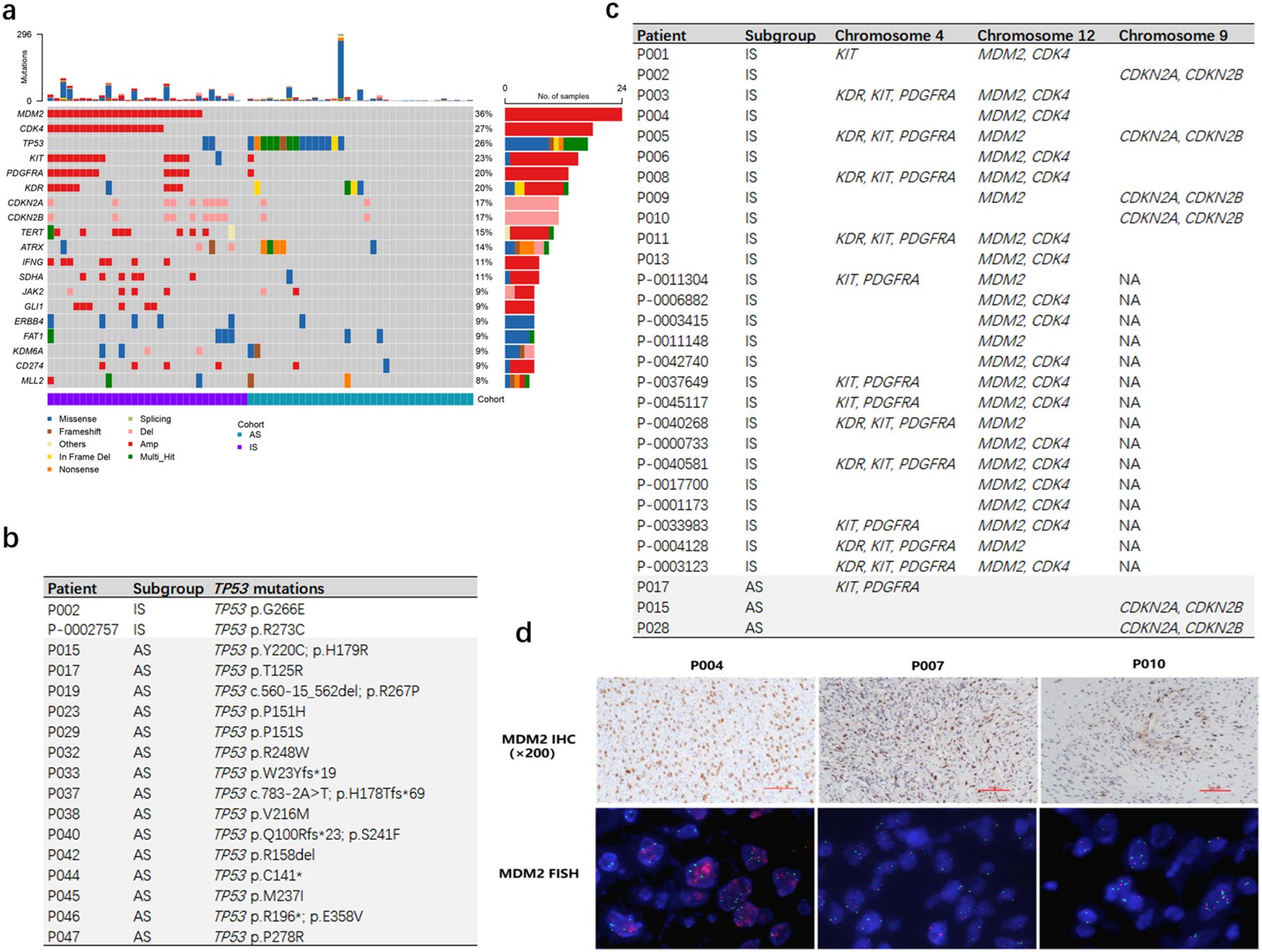Figure 2. Genomic mutation analysis of IS and AS patients. (A) The genetic landscape and clinical characteristics of 66 patients. The mutation landscape shows the variation of the top 20 genes with the highest mutation frequency in tumors. Each square shows the mutation of each sample provided by the patient in one gene. Different colors denote 8 types of mutations. (B) IS patients had a lower proportion of TP53 mutations. (C) IS patients had a higher proportion of copy number amplification in MDM2, CDK4, KIT, PDGFRA, KDR genes. (D) FISH analysis of MDM2 CNV in patients (P004, P007, P010) confirmed true positive of MDM2 in P004, but negative in P007 and P010. (MDM2 IHC, 200×).