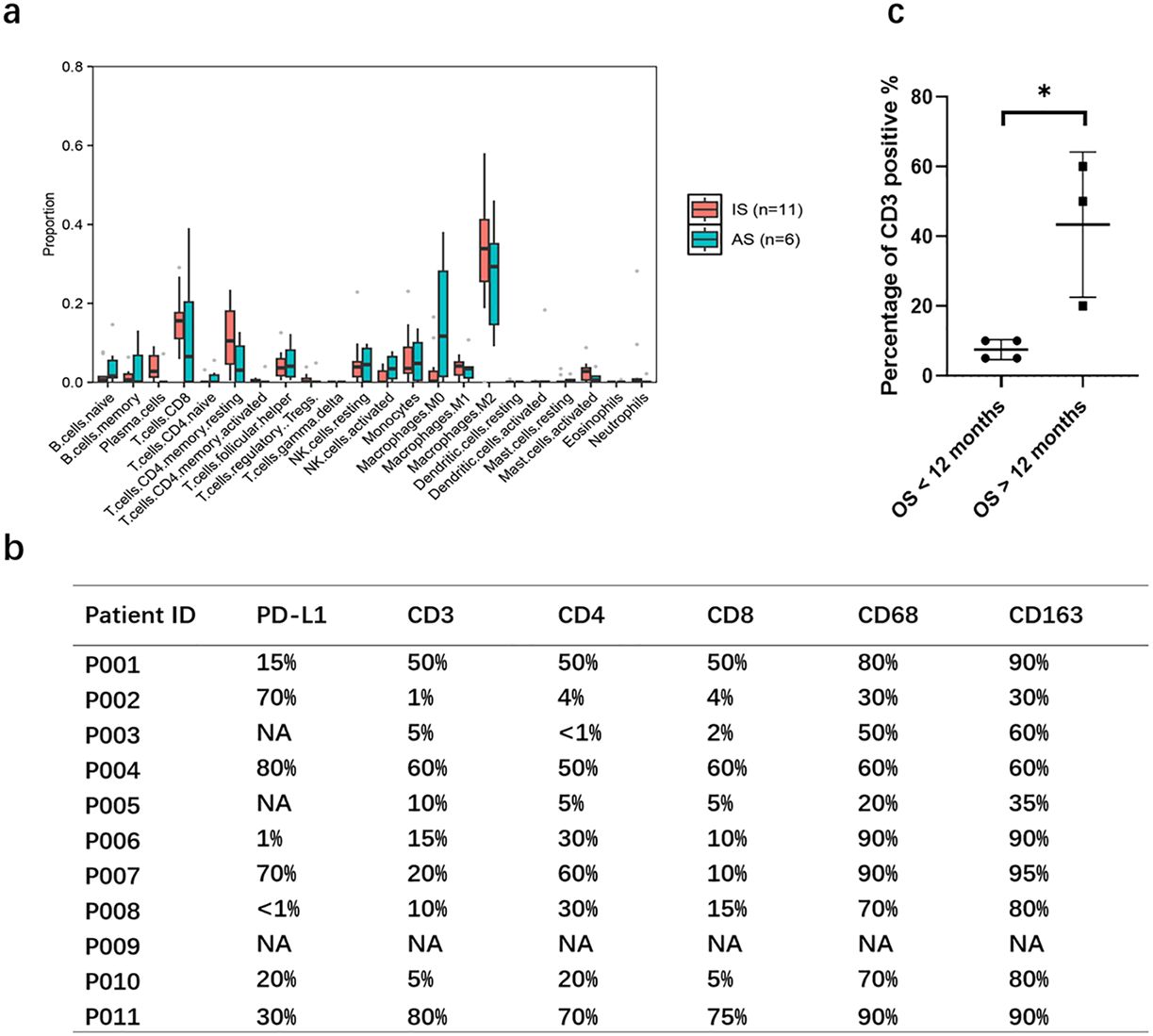 Figure 3. Characteristics of the immune microenvironment. (A) Analysis of 22 immune cell infiltration according to CIBERSORT algorithm showing the percentage of immune cells in each sample. (B) PD-L1 expression and immune cell infiltration of pulmonary artery intimal sarcoma. (C) Percentage of CD3 positive cells was lower in patients with overall survival (OS) less than 12 months. Statistical significance of differences between the groups was calculated with Mann Whiney U test. P-value< 0.05 is considered statistically significant. *p < 0.05.