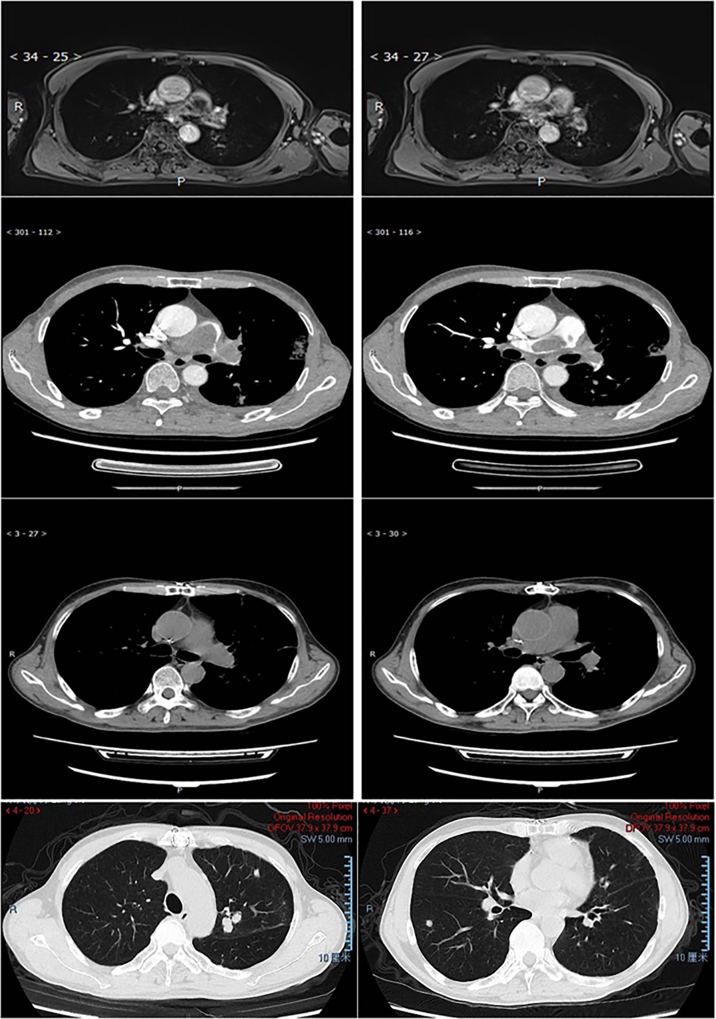 Figure 4. MRI/CT scan of the lung in patient P007. Row 1 (MRI) 2 (CTA), pulmonary artery intimal sarcoma involved PT, LPA, and RPA at diagnosis. Row 3-4, 12 months after PEA the patient relapsed with tumor involved left upper lobe, right lower lobe, and multiple little nodules in the peripheral lung.