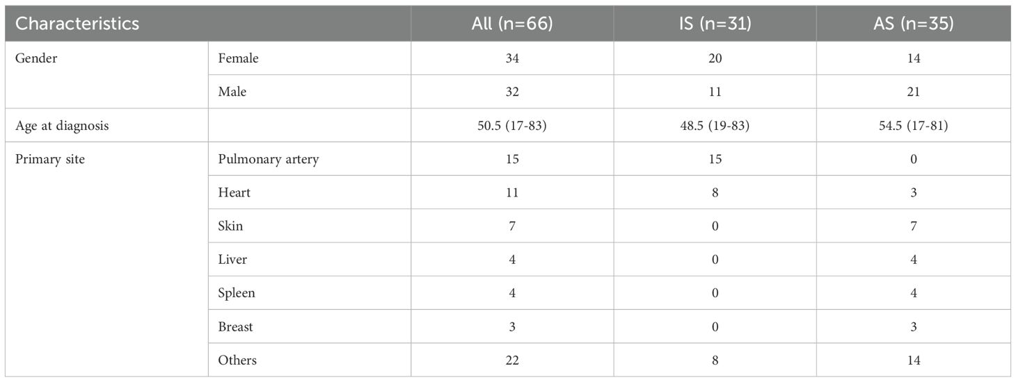 The cohort comprised 66 cases (34 females, 32 males) with a mean age of 50.5 years (range, 17–83 years). The IS subgroup exhibited a higher proportion of female patients (20/31) compared to the AS subgroup (15/35). Tumor primary sites differed significantly, with IS predominantly involving the pulmonary artery and heart, and AS primarily involving the skin (Table 1).