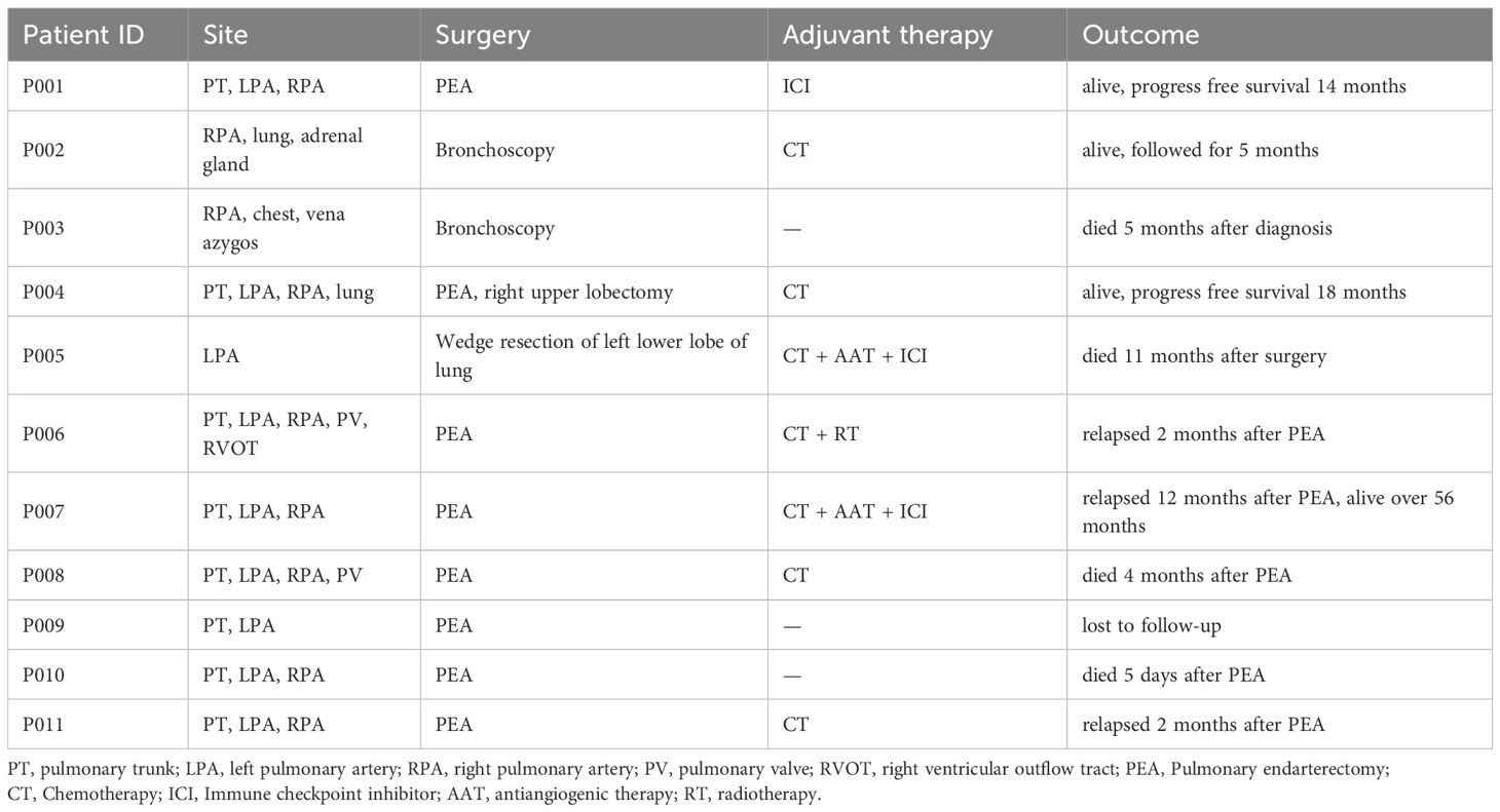 Among the 13 IS patients treated at our center, eight underwent pulmonary endarterectomy and one received wedge resection of the left lower lobe. Three patients died postoperatively on day 5, month 4, and month 11, respectively. Of the five surviving surgical patients, two maintained disease-free survival at 11–14 months. Two experienced relapse, while one patient relapsed at 12 months but remained alive for over 56 months with maintenance therapy comprising sintilimab (anti-PD-1 immunotherapy) and anlotinib (targeted therapy). Two patients did not undergo pulmonary artery tumor resection: one due to inoperability (adrenal metastasis) and another who refused surgery and succumbed to disease progression at 5 months (Table 2).