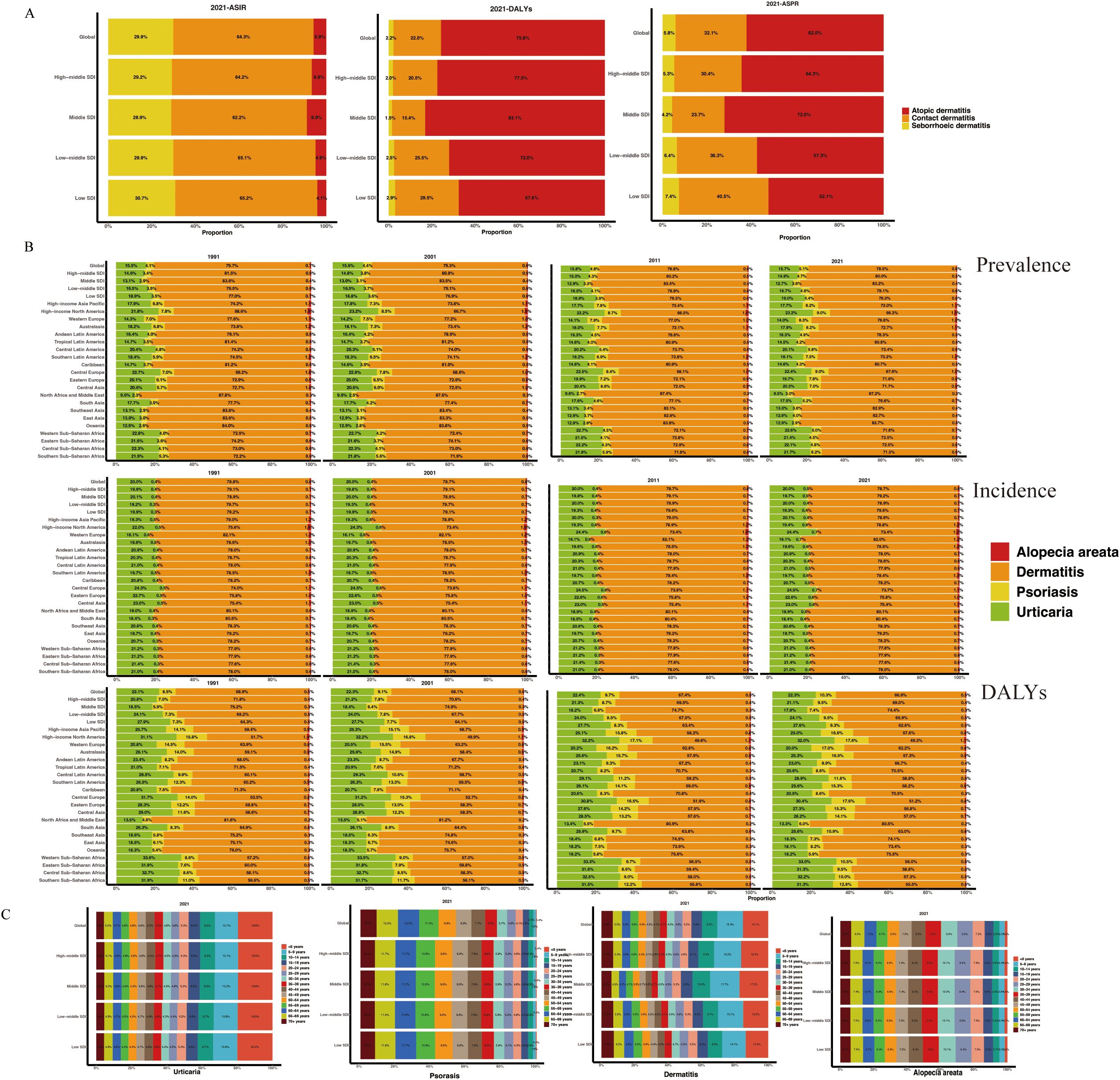 Figure 1. Proportion of dermatitis subtypes (A) and immune-related skin diseases (B) across 27 territories in ASPR. (C) Age-specific distribution of diseases by SDI region in 2021. ASPR, age-standardized prevalence rate; ASR, age-standardized rate; SDI, socio-demographic index.