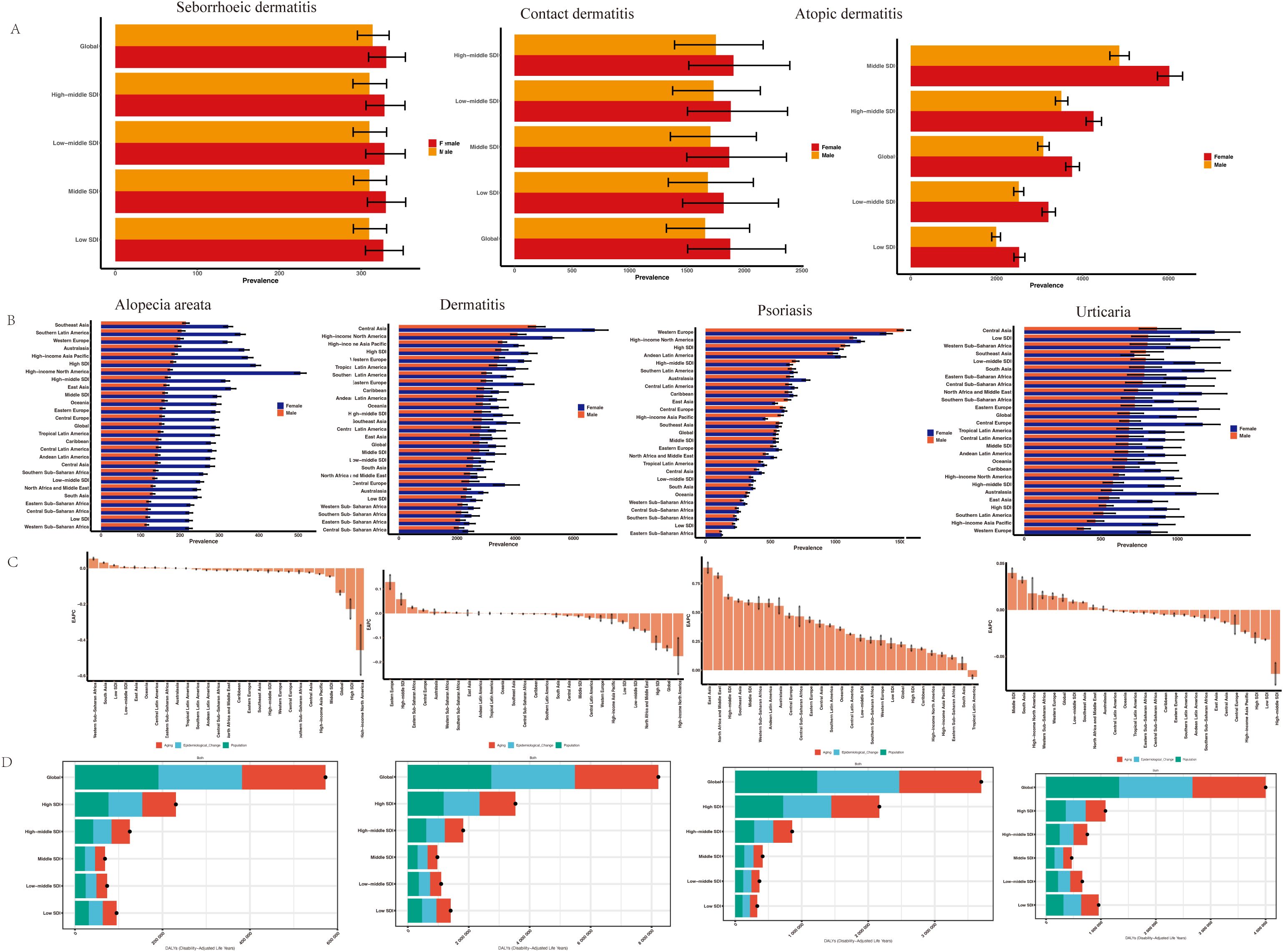 From 1991 to 2021, Figure 2C showed a mild global decline in alopecia areata prevalence (EAPC = -0.127; 95% CI: -0.172 to -0.083), with notable regional variation. Significant increases occurred in Western Sub-Saharan Africa and low-SDI regions, while declines were observed in High-income Asia Pacific and high-SDI regions. These trends suggest a rising burden in lower-SDI regions. The ASPR of dermatitis showed a significant declining trend (EAPC = -0.155; 95% CI: -0.222 to -0.089), though regional differences remained; Notable declines occurred in high-SDI regions (-0.151), North Africa and the Middle East (-0.068), low-middle SDI (-0.058), and low-SDI (-0.035), with the steepest drop in High-income North America, although the wide CI (-0.751 to 0.223) indicated instability. The ASPR of psoriasis increased globally, with an overall EAPC of 0.24 (95% CI: 0.12 to 0.35), while urticaria showed a minimal change, with an EAPC of 0.01 (95% CI: -0.01 to 0.03), suggesting a slightly increasing.