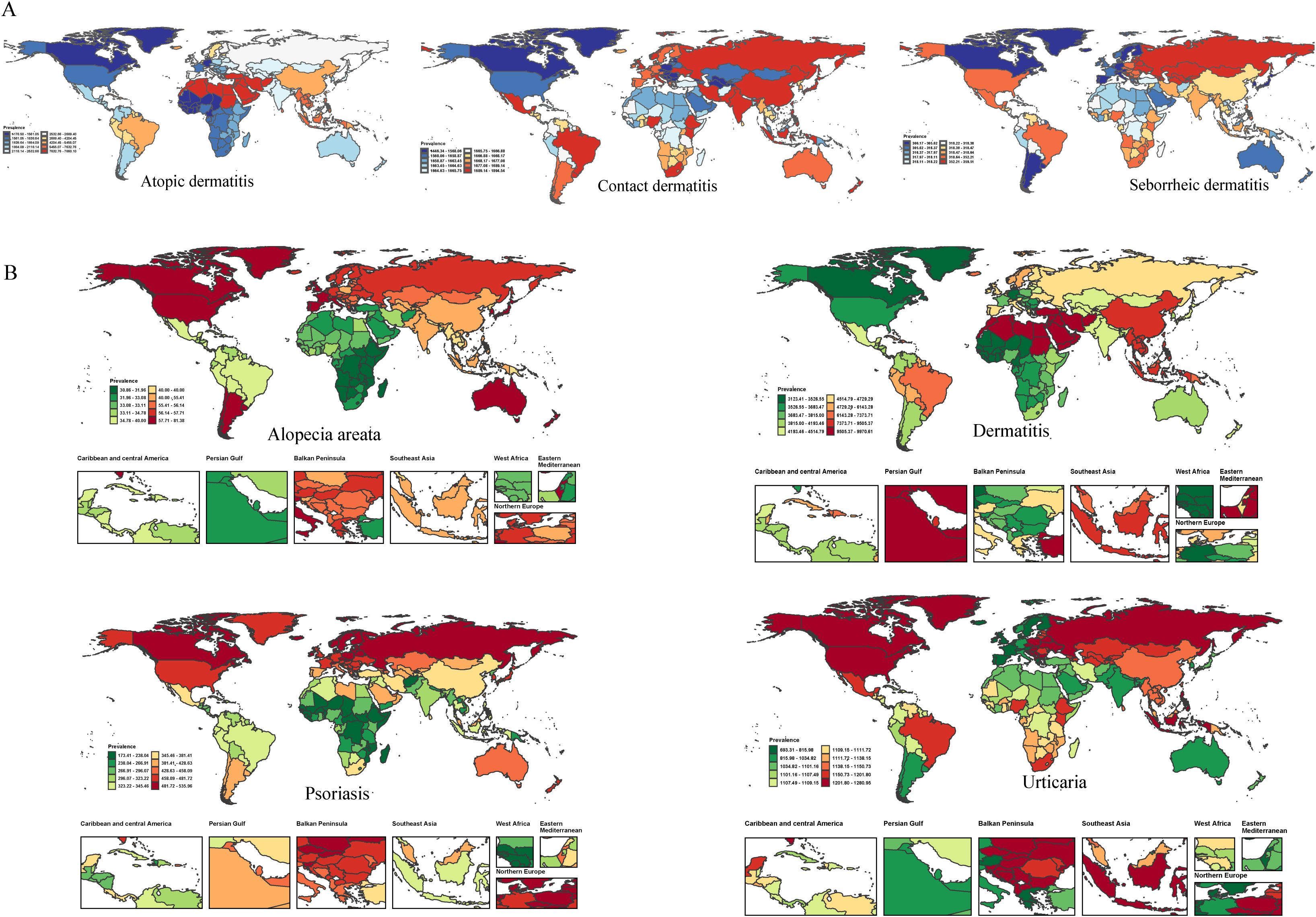 World maps illustrating the prevalence of various skin conditions across different regions. Panel A shows maps for atopic dermatitis, contact dermatitis, and seborrheic dermatitis, using color-coded prevalence scales. Panel B includes maps for alopecia areata, dermatitis, psoriasis, and urticaria with regional zoom-ins for the Caribbean and Central America, Persian Gulf, Balkan Peninsula, Southeast Asia, West Africa, Eastern Mediterranean, and Northern Europe. Each map uses a gradient to depict prevalence levels, from low to high.