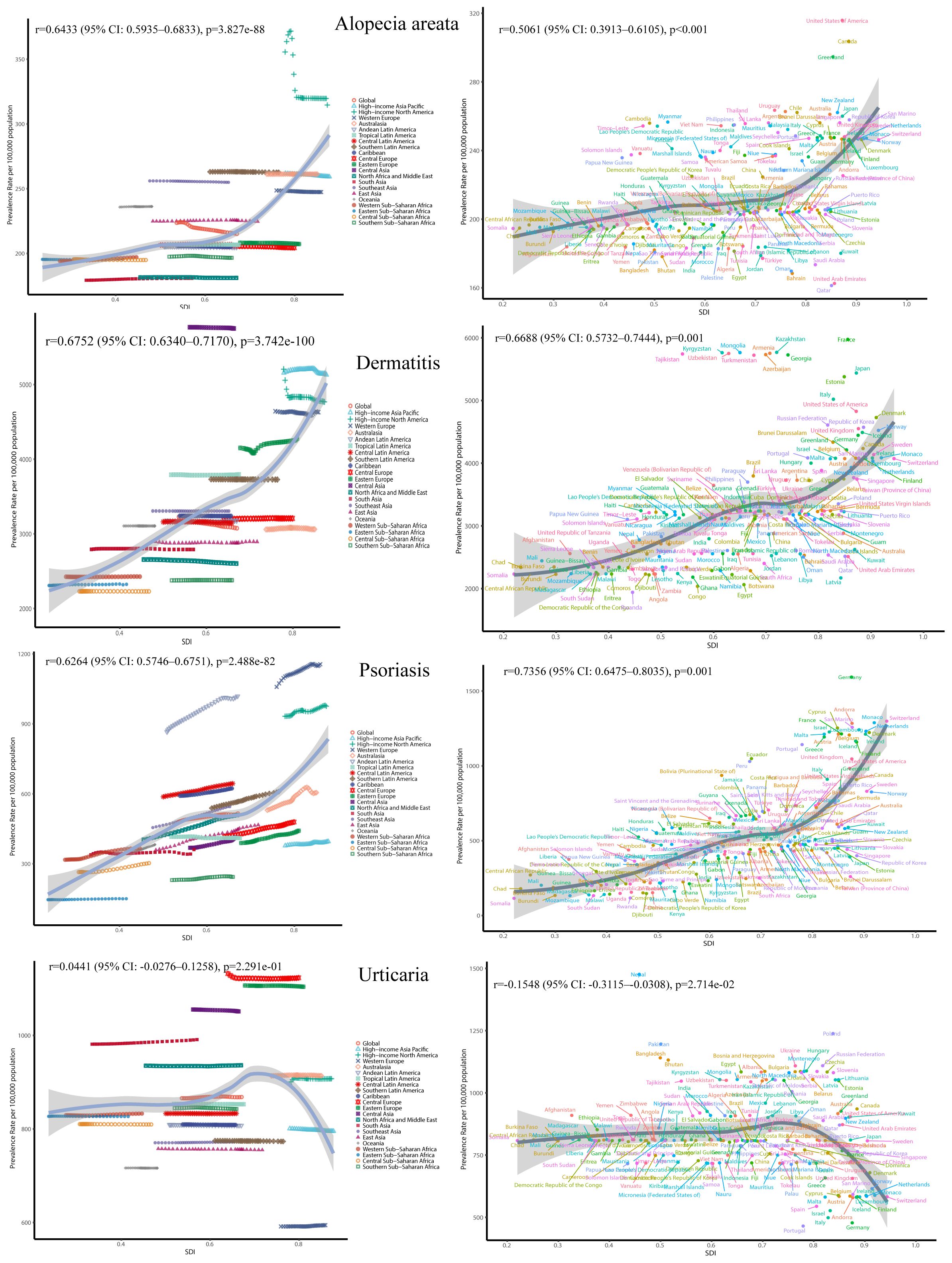 Two sets of graphs show the relationship between SDI (socio-demographic index) and disease prevalence for alopecia areata, dermatitis, psoriasis, and urticaria. Each row corresponds to one condition, with two graphs per condition. Left graphs display prevalence rates by region, with colored lines representing different global regions. Right graphs show prevalence rates per 100,000 population, with country labels plotted against SDI. Correlation coefficients and p-values indicate statistical significance for each condition.