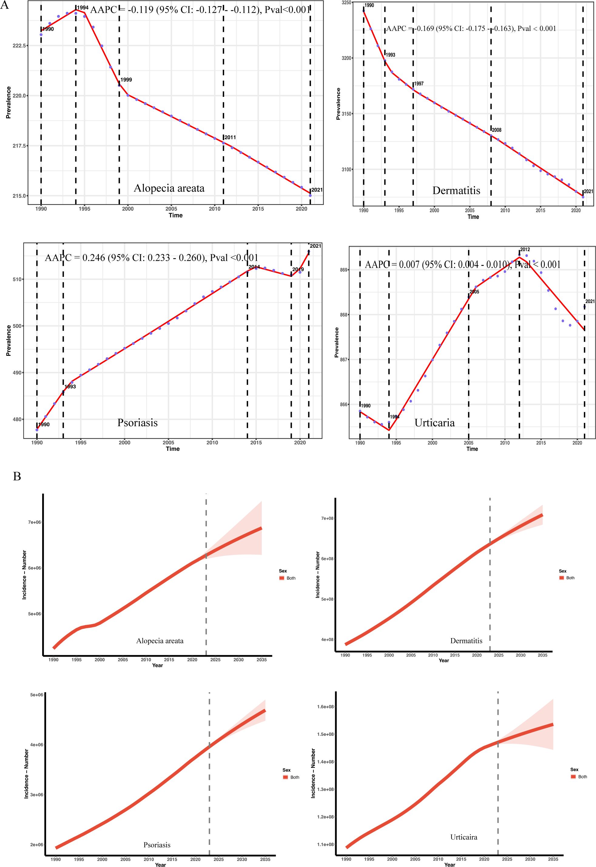 Panel A shows graphs depicting the prevalence trends of four conditions: Alopecia areata and Dermatitis show declining trends, while Psoriasis and Urticaria exhibit increasing trends from 1990 to 2021. Panel B illustrates projected incidence numbers for the same conditions from 1990 to 2035, with Alopecia areata, Dermatitis, Psoriasis, and Urticaria showing upward trends. Both panels use red lines for data representation.