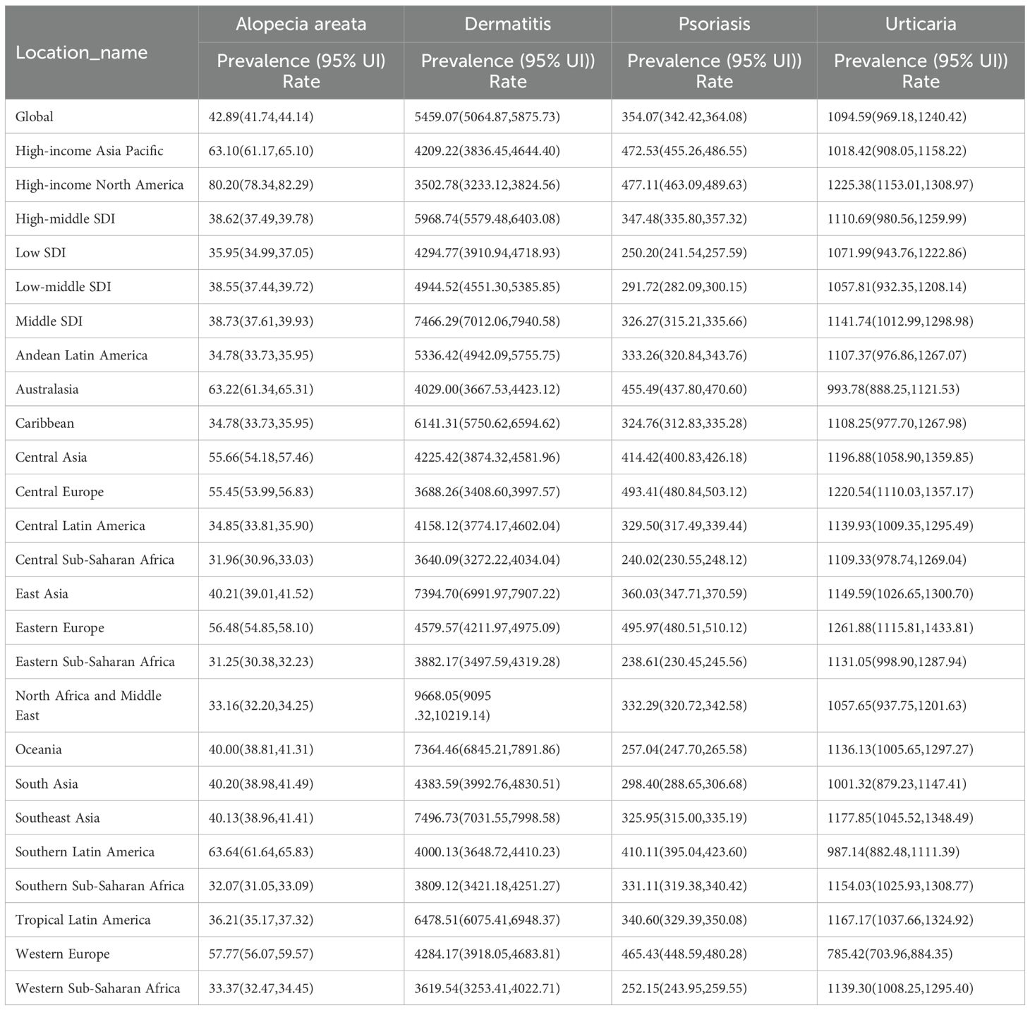 Globally, the age-standardized prevalence rates of major inflammatory and immune-related skin diseases displayed significant regional variation in 2021. Dermatitis bore the greatest burden among the four conditions, with a global ASPR of 5459.07 (95% UI: 5064.87–5875.73) per 100,000 population, followed by urticaria at 1094.59 (969.18–1240.42), psoriasis at 354.07 (342.42–364.08), and alopecia areata at 42.89 (41.74–44.14) in Table 1. Across all regions, dermatitis consistently represented the largest proportion of the disease burden, highlighting its widespread public health impact. In contrast, alopecia areata showed the lowest prevalence overall, albeit with modest regional variations.