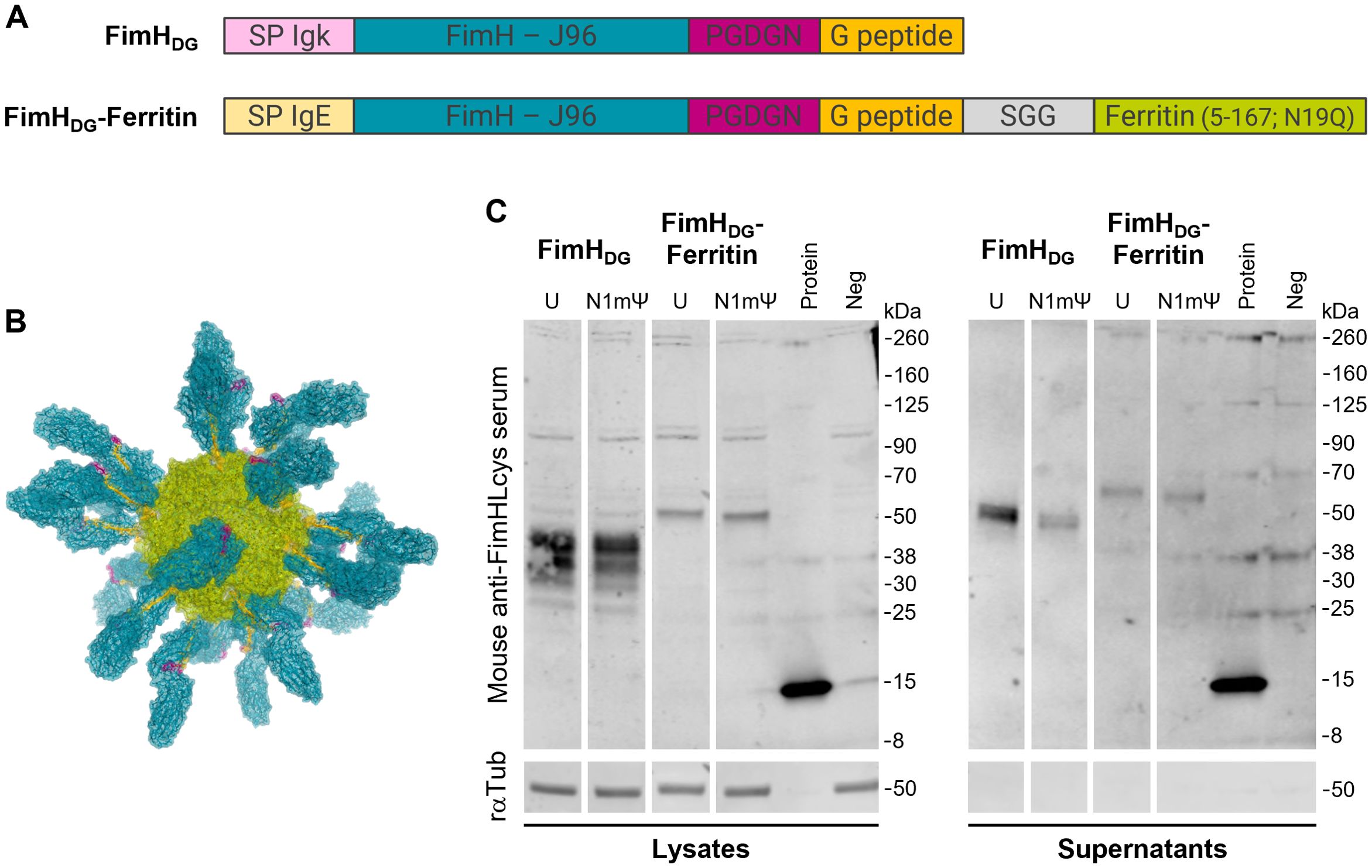 Figure 1. Proteins translated from mRNAs encoding FimHDG or FimHDG-Ferritin are secreted in cell culture. (A) Schematic representation (depiction not to scale) of the open reading frames (ORFs) of mRNAs encoding FimHDG or FimHDG-Ferritin. The ORFs include a signal peptide (SP IgE or SP Igk) at the N-terminus, followed by FimH from E. coli strain J96 (FimH - J96), a 5-amino acid (aa) linker (PGDGN), and the donor strand peptide of FimG (G peptide). The ORF of FimHDG-Ferritin contains an additional 3-aa linker (SGG) and the ferritin domain from H. pylori strain J99 (Ferritin [5-167; N19Q]) at the C-terminus. (B) Predicted structure of an mRNA-derived FimHDG-Ferritin protein nanoparticle (PNP). The expressed fusion protein FimHDG-Ferritin is expected to be presented to cells of the immune system as secreted self-assembled 24-mer PNPs. Each PNP is expected to consist of a ferritin core (green) displaying 24 copies of FimH (blue) stabilized in a pre-binding conformation by the PGDGN-linked (pink) donor strand peptide of FimG (yellow) on its surface. FimHDG-Ferritin denotes the fusion of FimH with the donor strand peptide of FimG (DG) and the H. pylori ferritin domain using an SGG-linker (grey). (C) HEK 293T cells were transfected with LNP-formulated mRNA containing either unmodified (U) or modified (N1mΨ) nucleosides encoding either FimHDG or FimHDG-Ferritin. FimH expression in cell lysates and supernatants was analyzed via western blotting 48 h post transfection. HEK 293T cells incubated with medium served as negative control (Neg) and 100 ng recombinant FimHL protein loaded to the gels was used as positive control (Protein). Rabbit anti-tubulin antibody (rαTub) was employed as loading control. Uncropped images are shown in Supplementary Figure S1.