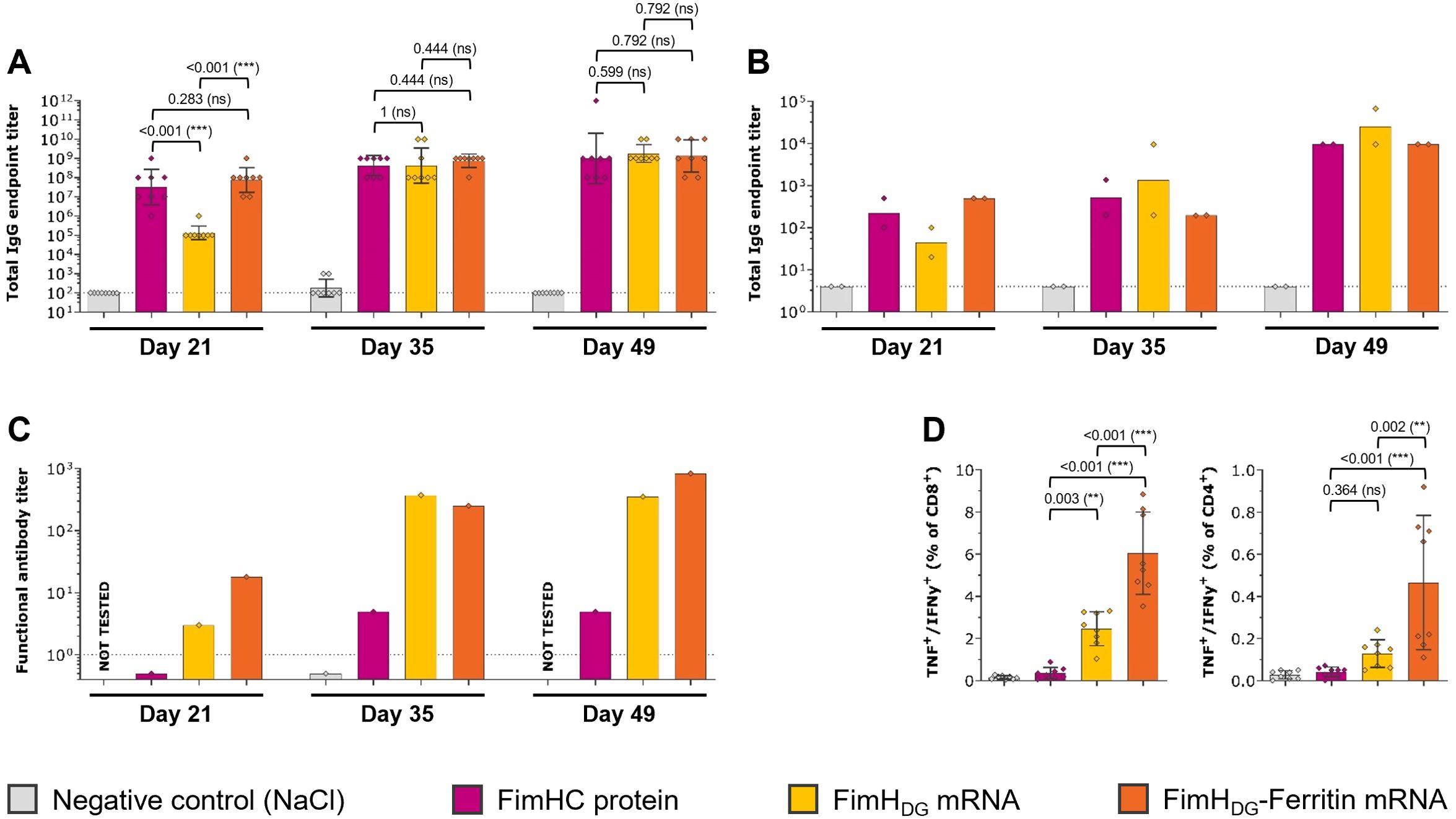 Figure 2. FimH-based mRNA vaccines containing unmodified nucleosides induced robust levels of both humoral and cellular immune responses in mice. Female BALB/c mice (n=8/group) were vaccinated IM three times on Day 0, 21, and 35 with 2 µg of PHAD-adjuvanted FimHC protein complex subunit vaccine (pink bars), 2 µg of FimHDG mRNA vaccine (yellow bars), or 2 µg of FimHDG-Ferritin mRNA vaccine (orange bars). Mice receiving physiological saline (0.9% NaCl; grey bars) served as negative controls. FimHL-specific binding antibody endpoint titers in serum (A) or urine (B), determined by ELISA, as well as functional serum antibody titers measured by BAI assay (C) in samples collected after one (Day 21), two (Day 35), or three (Day 49) vaccinations are displayed. Multifunctional TNF/IFN-γ-positive CD4+ and CD8+ T cells (D) were analyzed in splenocytes isolated on Day 49 by stimulation with FimH-specific peptides followed by intracellular cytokine staining and detection by flow cytometry. The gating strategy for this analysis is shown in Supplementary Figure S2. In (A, D), diamond symbols represent individual animals, and bars depict either geometric means with geometric SD in (A) or means with SD in (D). Each bar shown in (B) represents the geometric mean of two urine pools per group, each containing urine from four animals. Each bar depicted in (C) represents one functional antibody titer per group, determined based on pooled serum samples derived from all animals in the respective group. Dotted lines indicate the lower limit of quantification (LLOQ). Values below the LLOQ were set to 0.5 (non-responders in BAI assay; C). Data from individual days displayed in (D) were statistically analyzed using an ANOVA followed by the LSD post test. P values are displayed and significant differences between vaccines are marked by asterisks (**P < 0.01, ***P < 0.001; ns, not significant).