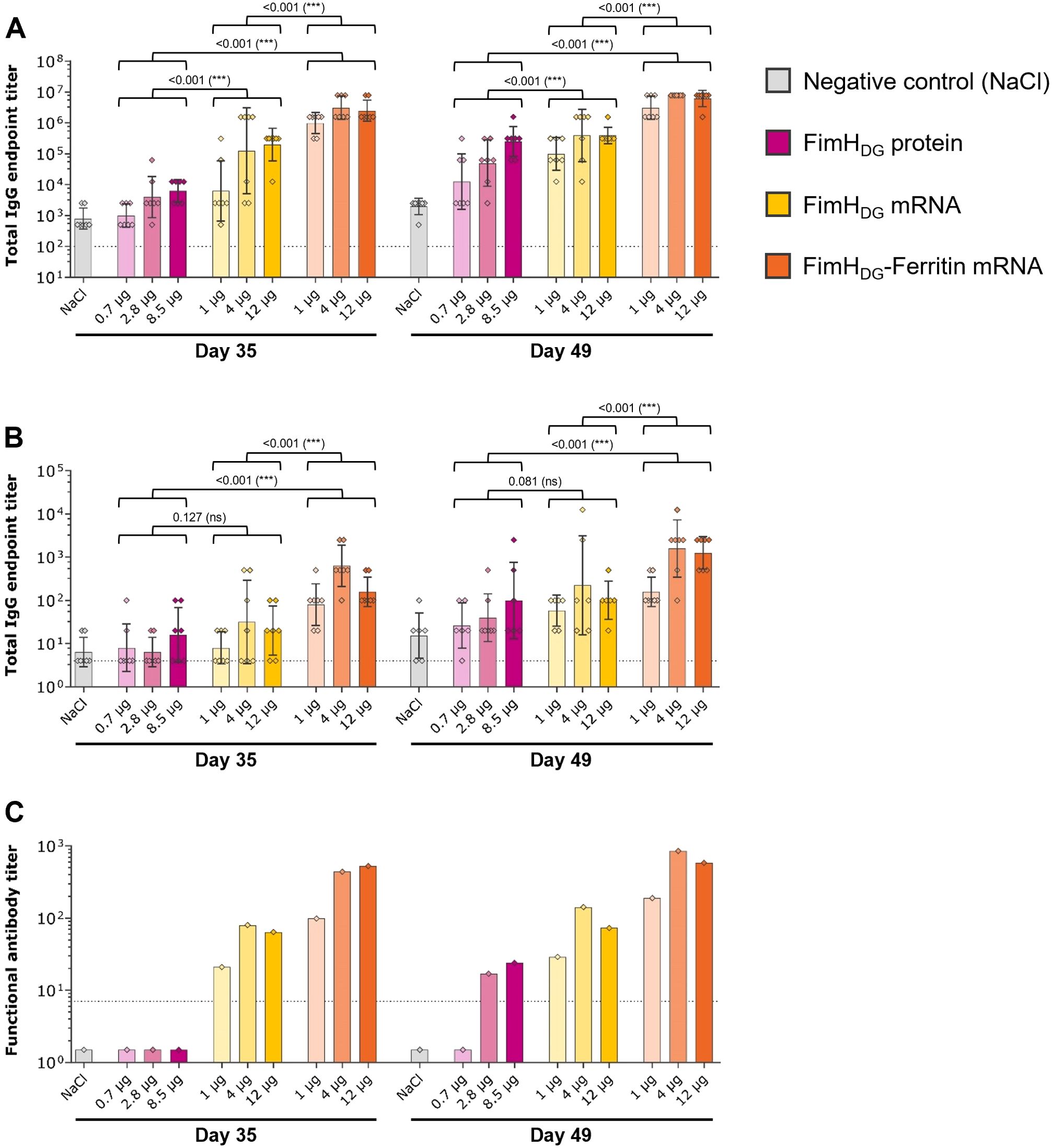 Figure 3. FimH-based mRNA vaccines using unmodified nucleosides induced robust levels of binding and functional antibody responses in rats. Female Wistar rats (first rat study; n=7/group) were vaccinated IM three times on Day 0, Day 21, and Day 35 with different doses of AS01-adjuvanted FimHDG protein subunit vaccine (pink bars), FimHDG mRNA vaccine (yellow bars), or FimHDG-Ferritin mRNA vaccine (orange bars) as indicated. Rats receiving physiological saline (0.9% NaCl; grey bars) served as negative controls. FimHL-specific binding antibody endpoint titers in serum (A) or urine (B), determined by ELISA, as well as functional serum antibody titers measured by BAI assay (C) in samples collected after two (Day 35) or three (Day 49) vaccinations are displayed. In (A, B), diamond symbols represent individual animals, and bars depict geometric means with geometric SD. Each bar depicted in (C) represents one functional antibody titer per group, determined based on pooled serum samples derived from all animals in the respective group. Dotted lines indicate the lower limit of quantification (LLOQ). Values below the LLOQ were set to 1.5 (non-responders in BAI assay; C). Individual days were statistically analyzed using an ANOVA followed by the LSD post test. P values are displayed and significant differences between vaccines across the doses tested are marked by asterisks (***P < 0.001; ns, not significant).