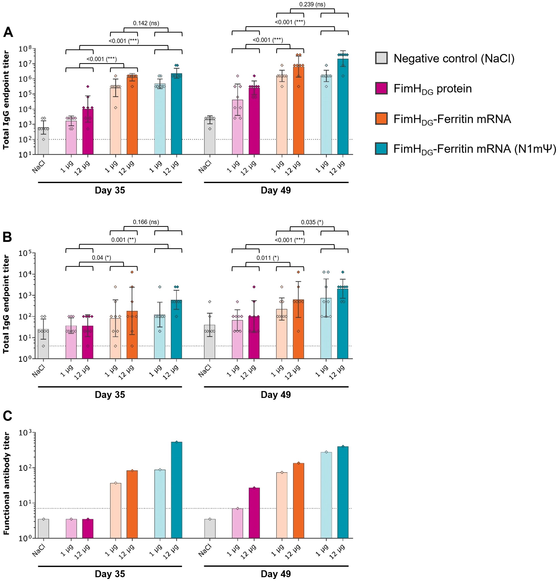 Figure 4. An mRNA vaccine using N1mΨ-modified nucleosides encoding FimHDG-Ferritin induced robust levels of binding and functional antibody responses in rats. Female Wistar rats (second rat study; n=8/group) were vaccinated IM three times on Day 0, Day 21, and Day 35 with different doses of AS01-adjuvanted FimHDG protein subunit vaccine (pink bars), FimHDG-Ferritin mRNA vaccine containing unmodified nucleosides (orange bars), or FimHDG-Ferritin mRNA vaccine containing N1mΨ-modified nucleosides (blue bars) as indicated. Rats receiving physiological saline (0.9% NaCl; grey bars) served as negative controls. FimHL-specific binding antibody endpoint titers in serum (A) or urine (B), determined by ELISA, as well as functional serum antibody titers measured by BAI assay (C) in samples collected after two (Day 35) or three (Day 49) vaccinations are displayed. In (A) and (B), diamond symbols represent individual animals, and bars depict geometric means with geometric SD. Each bar depicted in (C) represents one functional antibody titer per group, determined based on pooled serum samples derived from all animals in the respective group. Dotted lines indicate the lower limit of quantification (LLOQ). Values below the LLOQ were set 3.5 (non-responders in BAI assay; C). Individual days were statistically analyzed using an ANOVA followed by the LSD post test. P values are displayed and significant differences between vaccines across the doses tested are marked by asterisks (*P < 0.05, **P < 0.01, ***P < 0.001; ns, not significant).