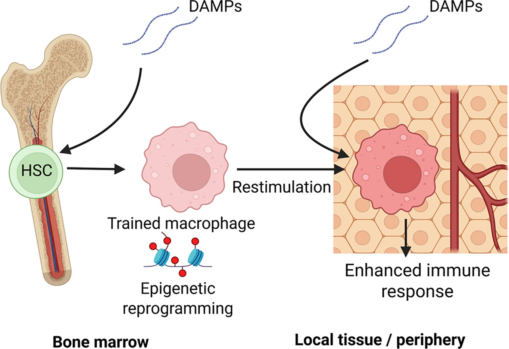 Innate memory exists at the level of the local tissue through “peripheral training” while “central training” occurs at the level of Hematopoietic Stem and Progenitor cells (HSPC) such as myeloid progenitor cells in the bone marrow (Figure 1). In BCG-vaccination studies, induction of BCG into bone marrow can induce epigenetically modified macrophages with improved clearance of pathogens (30). However, central reprogramming are not limited to PAMP activity. Duchenne muscular dystrophy (DMD) is a fatal genetic disease linked to trained immunity. In a study using adoptive transfer of bone marrow-derived macrophages from DMD mice to control mice, hyperreactive macrophages could last up to 11 weeks post-transplant (31). DAMPs such as heme can activate hematopoietic stem cells in the bone marrow resulting in both increased percentage and frequency of myeloid lineage differentiation correlating with TRIM-related epigenetic changes and in-vivo resistance to bacterial sepsis (9). Finally, a recent study linked a transient occlusion of the middle cerebral artery to upregulated TRIM responses that persisted in monocytes and macrophages for up to 3 months post-injury (32). This was linked to epigenetic remodeling of bone marrow derived cells, establishing a link between neurological injury to cardiac dysfunction and highlighting a clinical application of DAMP induced training on central immune processes.