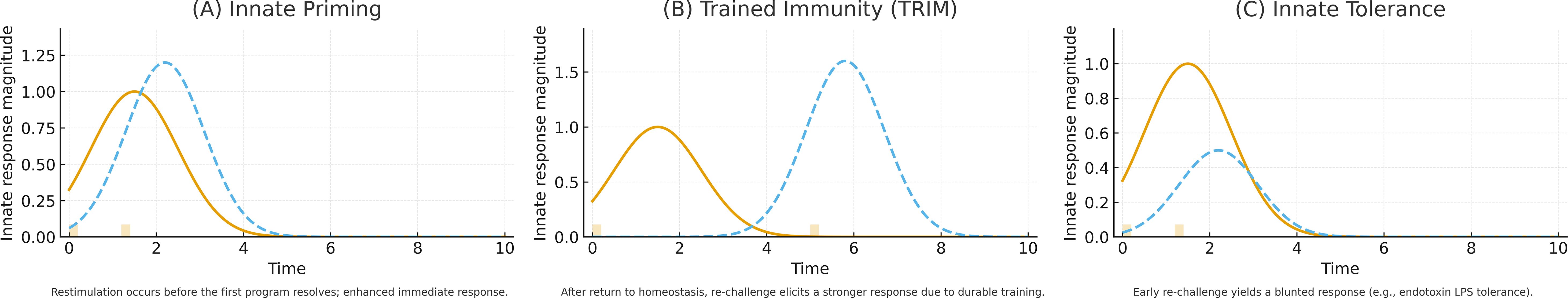 Figure 2. Three forms of innate immunological memory are elicited by common PRR activation and epigenetic/metabolic rewiring but differ in kinetics and functional outcome. (A) Innate priming is transient; re-stimulation before completion of the first transcriptional program yields an enhanced immediate response (orange line, primary response; blue dotted line, re-challenge response). (B) TRIM persists beyond return to metabolic homeostasis, enabling an augmented response to delayed re-challenge. (C) Innate tolerance occurs on a similar timescale to priming, but early re-stimulation produces a blunted response; endotoxin (LPS) tolerization is a canonical example.