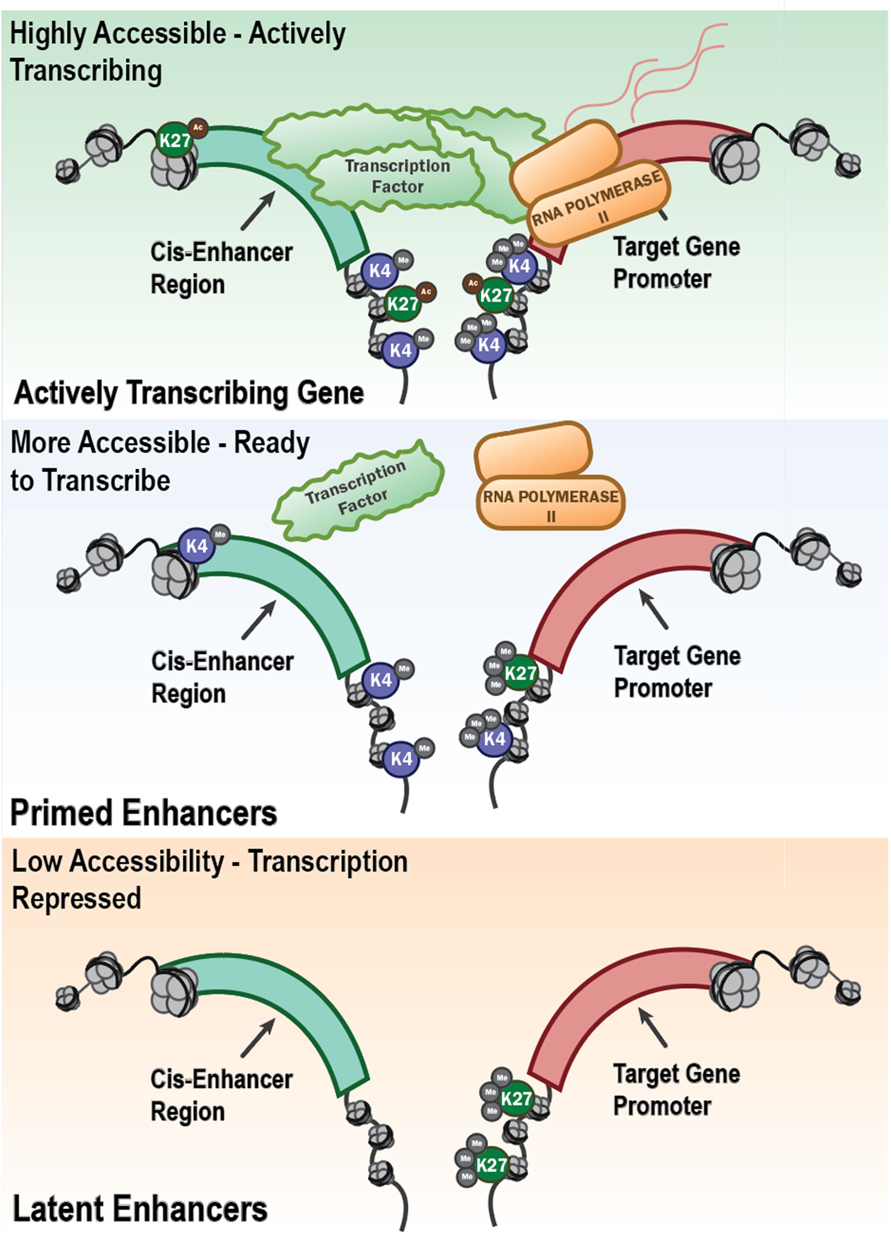 Figure 3. Epigenetic regulation of gene transcription through enhancer accessibility and histone modifications. This schematic illustrates the progressive chromatin states that define the transcriptional potential of innate immune genes. Open chromatin with active histone modifications (e.g., H3K4me3 and H3K27ac) at both the cis-enhancer region and gene promoter allows recruitment of transcription factors and RNA polymerase II, resulting in active transcription. This is shown as “Highly Accessible – Actively Transcribing” (top panel) in the schematic. Other regions, “Primed Enhancers” (middle panel) are regions that are more accessible and marked by H3K4me1 at enhancers and H3K4me3 at promoters, with limited or absent H3K27 acetylation. They are poised for rapid activation but not actively transcribing, representing a key feature of trained innate immunity. In contrast, “Latent Enhancers” (bottom panel) have closed chromatin marked by H3K27me3 or a lack of activating histone marks which are associated with low accessibility and transcriptional repression. These regions may become activated under specific stimuli or remain epigenetically silenced, characteristic of immune tolerance. Together, these chromatin states underlie the long-term transcriptional reprogramming that defines trained immunity or tolerance in innate immune cells.