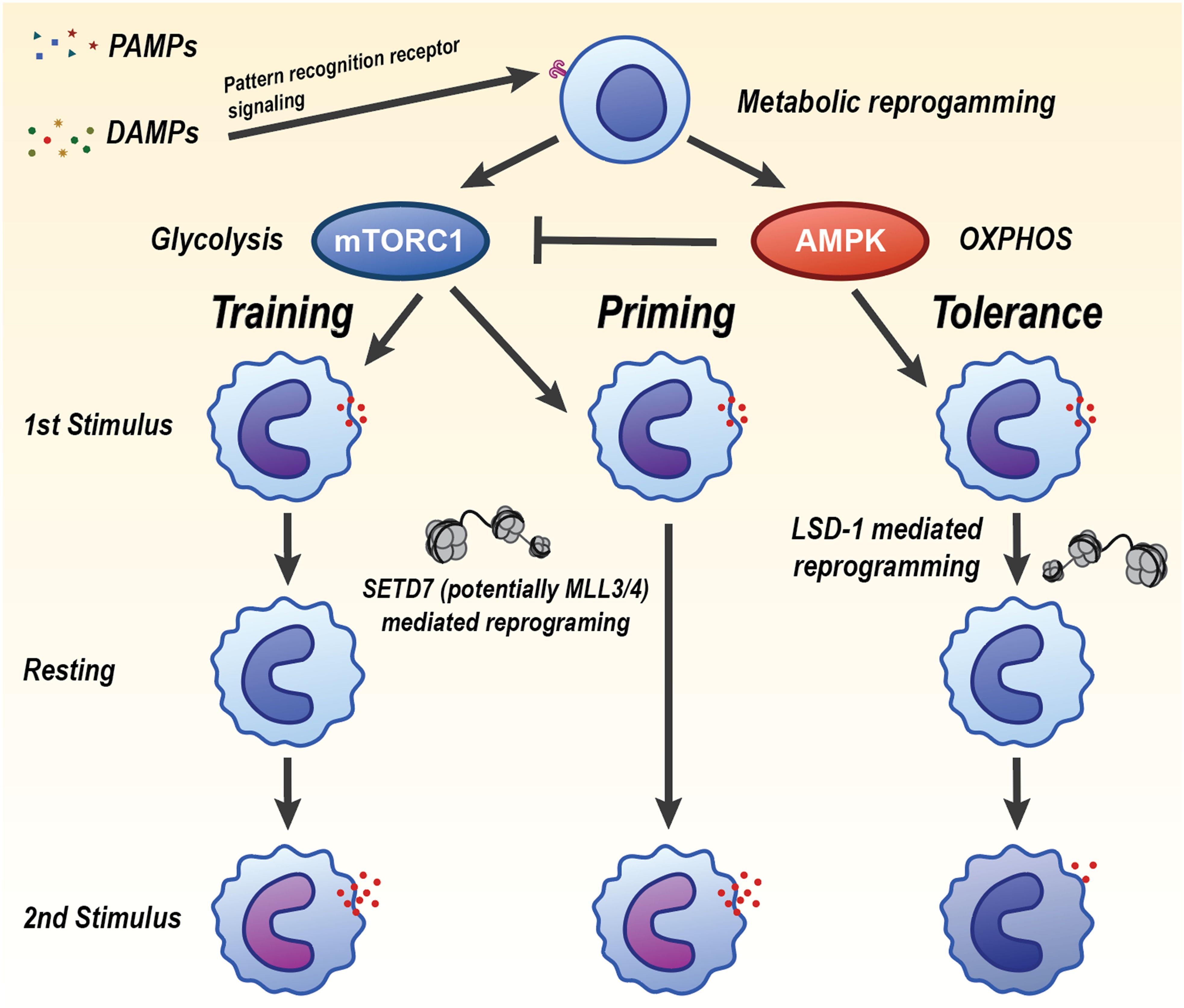 Figure 4. Divergent innate immune memory states induced by PAMPs and DAMPs through metabolic and epigenetic reprogramming. Pathogen-associated molecular patterns (PAMPs) and damage-associated molecular patterns (DAMPs) signal through pattern recognition receptors to initiate metabolic reprogramming in innate immune cells. The balance of mTORC1 and AMPK activity may determine whether the cell undergoes trained immunity, priming, or tolerance. Trained immunity is driven by mTORC1 activation and increased glycolysis, leading to heightened inflammatory responses upon secondary challenge. This is maintained by SETD7- and possibly MLL3/4-mediated epigenetic reprogramming. Tolerance is characterized by AMPK-driven oxidative phosphorylation (OXPHOS), reduced inflammatory cytokine production, and is reinforced by LSD1-mediated chromatin remodeling. Priming represents an intermediate or poised state that can resolve into training or tolerance depending on context and secondary cues. Each state is associated with a distinct transcriptional and functional response upon restimulation, regulated by metabolic pathways and histone-modifying enzymes that mediate long-term gene expression changes.