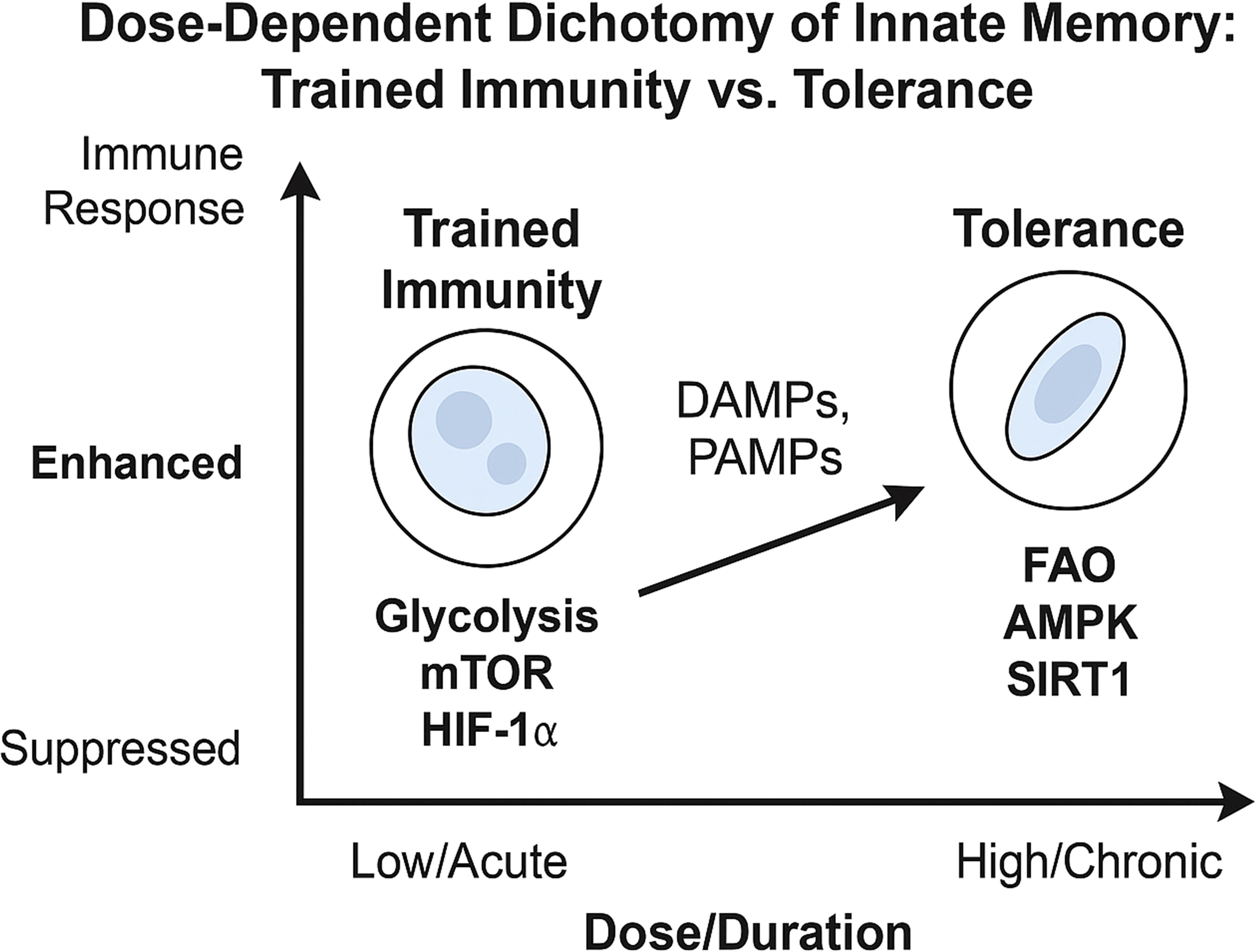 Figure 5. Dose-Dependent dichotomy of trained immunity vs. tolerance. This schematic depicts how low/acute vs. high/chronic doses of DAMPs (or PAMPs) drive innate cells toward either a trained or tolerant phenotype. Low-dose or acute exposure to PAMPs or DAMPs typically activates mTORC1 and HIF-1α–driven glycolysis, leading to trained immunity, characterized by enhanced cytokine production, increased metabolic activity, and epigenetic remodeling (e.g., H3K4me3, H3K27ac) that primes the cell for heightened responses upon secondary stimulation. High-dose or repeated stimulation instead promotes activation of AMPK, SIRT1, and autophagy pathways, resulting in immune tolerance. This state features suppressed inflammatory responses, increased fatty acid oxidation (FAO), and repressive epigenetic modifications (e.g., H3K9me3), which collectively dampen reactivity to subsequent challenges.